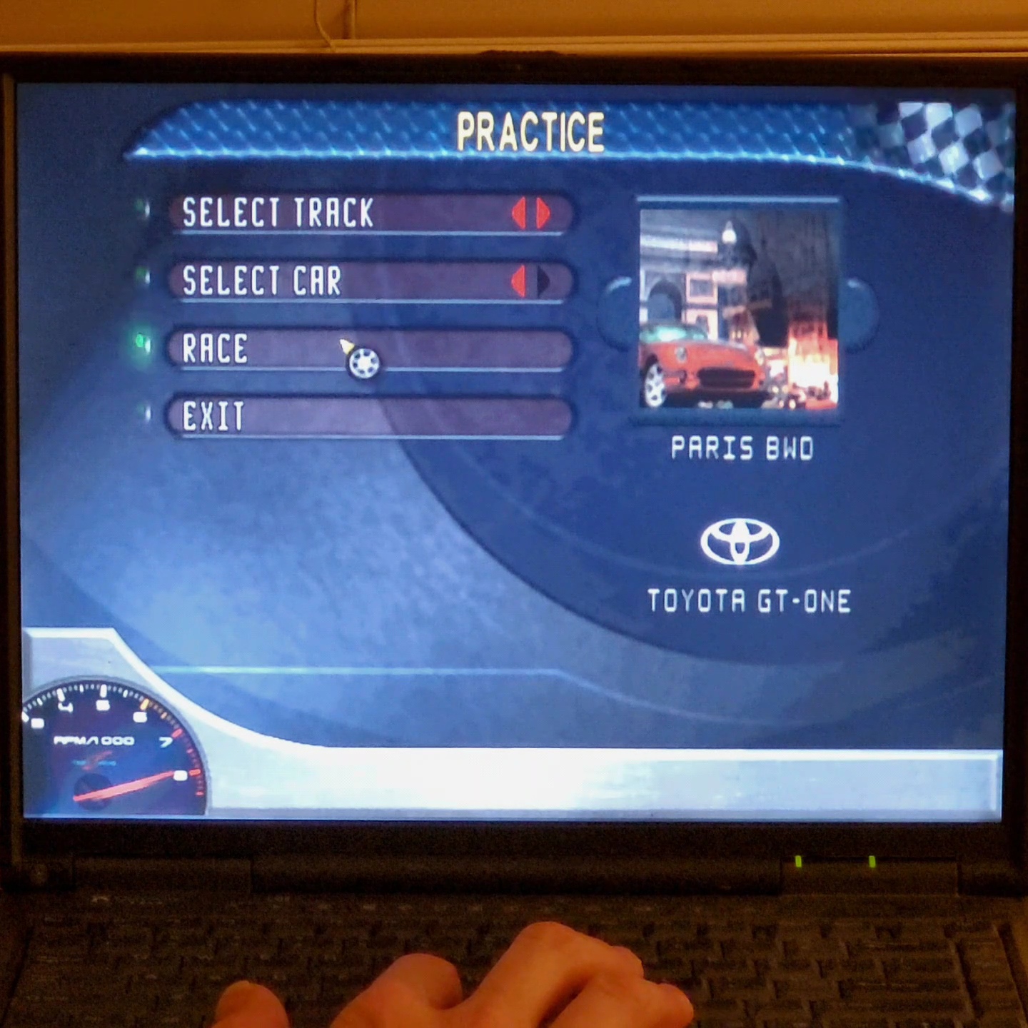 Hardware checked, game checked, Traffic Off / Cops Off / Practice mode checked, Paris BWD selected, gameplay checked, time checked.