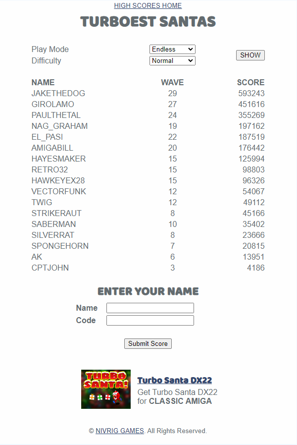 My fourth "Endless Mode / Normal Difficulty" run for the Turbo Santa! 22 DX High-Score Challenge after having an intense back and forth with Girolamo.