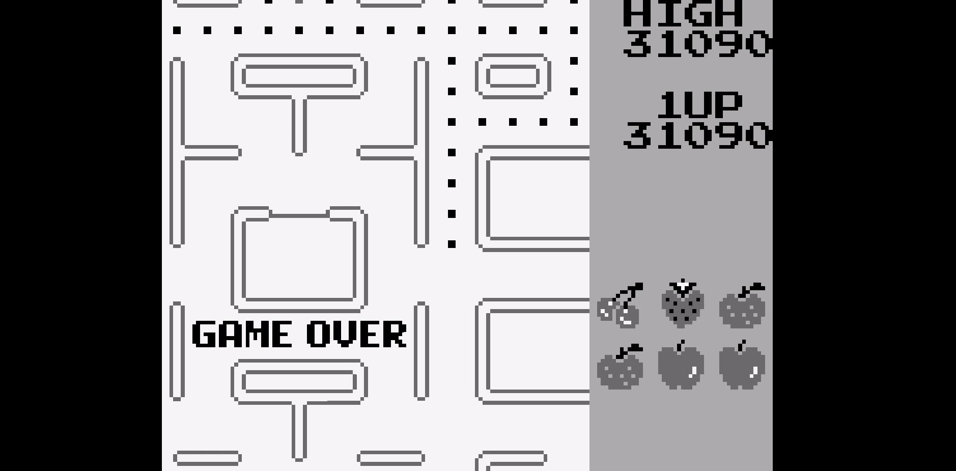 Play the game in 1 player mode with default settings. - The full screen view is allowed : To view the entire playing area at once (everything will be smaller to compensate), press Left/Right at the title screen. You will see a "1/2" appear next to the 1 Player option. Begin a game and the board will be fully visible. - You earn an extra life after racking up 10000 points, and that's it. - HUD @ start : 2 lives and cherry fruit is stage 1. Stage 1 : Cherry - 100pts Stage 2 : Strawberry - 300pts Stage 3-4 : Peach - 500pts Stage 5-6 : Apple- 700pts Stage 7-8 : Kiwi - 1000pts Stage 9-10 : Galaxian - 2000pts Stage 11-12 : Bell - 3000pts Stage 13+ : Key - 5000pts |