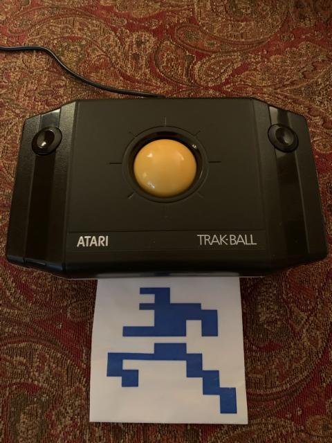 Atari 2600 console, difficulty levels, Decathlon cartridge and Trak Ball controller all shown after the game.