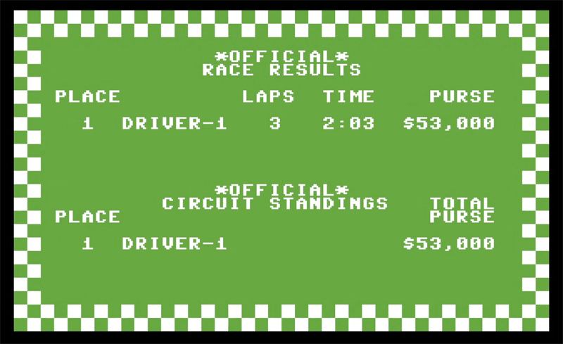 Pitstop is a 1983 racing game from Epyx. It was written by Jamie Faye Fenton (Beamrider)There are six tracks and 3 skill levels to play at. Races can be 3, 6 or 9 laps and there is a pitsop option to repair tyres and refuel. You'll need that for the longer races and you actually control the members of the pit crew. There are 3 types of race to enter - Single (choose one track), Mini-circuit (three tracks) and Grand-Circuit (all six tracks).