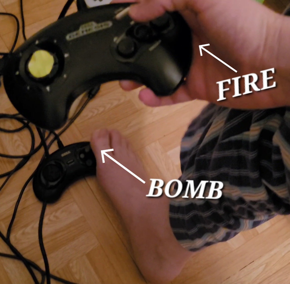 I have the Seagull78 adapter attached to controller port 2 in order to use the C button which is easier to reach than B with thy toe. Oddly have gotten very use to the footpedal bomb.. toe pedal..