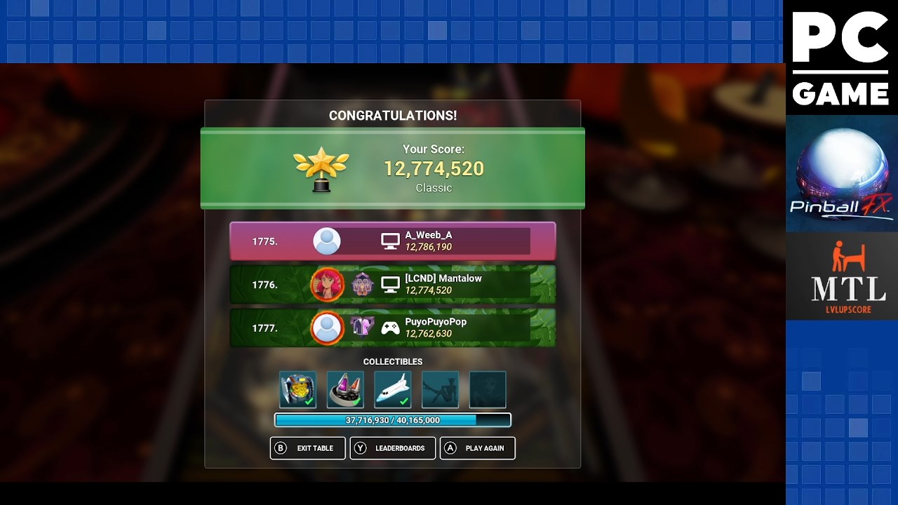 Game checked, table checked, gameplay checked, score checked, initials checked, Classic Mode confirmed.