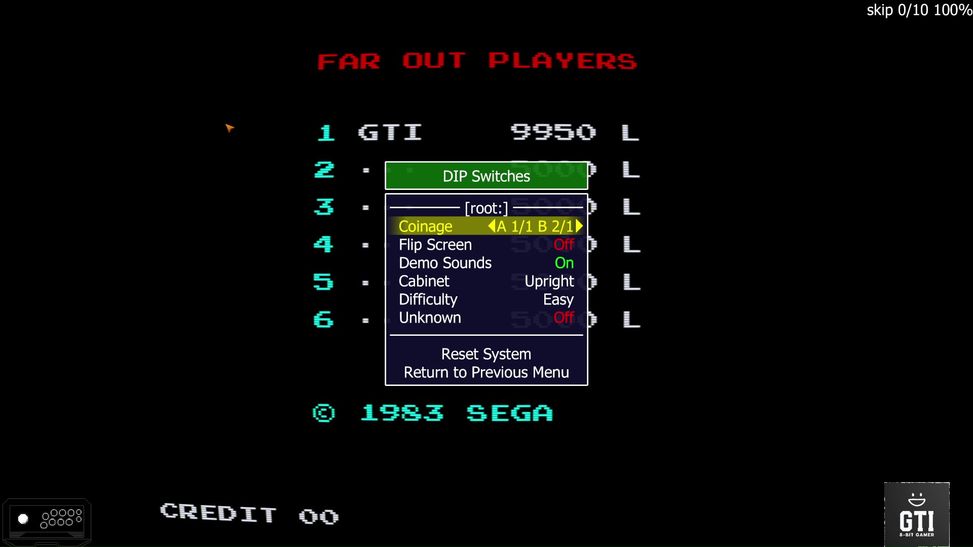 Play the game in 1 player mode with default settings: Coinage A1 / 1 B 2/1 Difficulty: Easy |