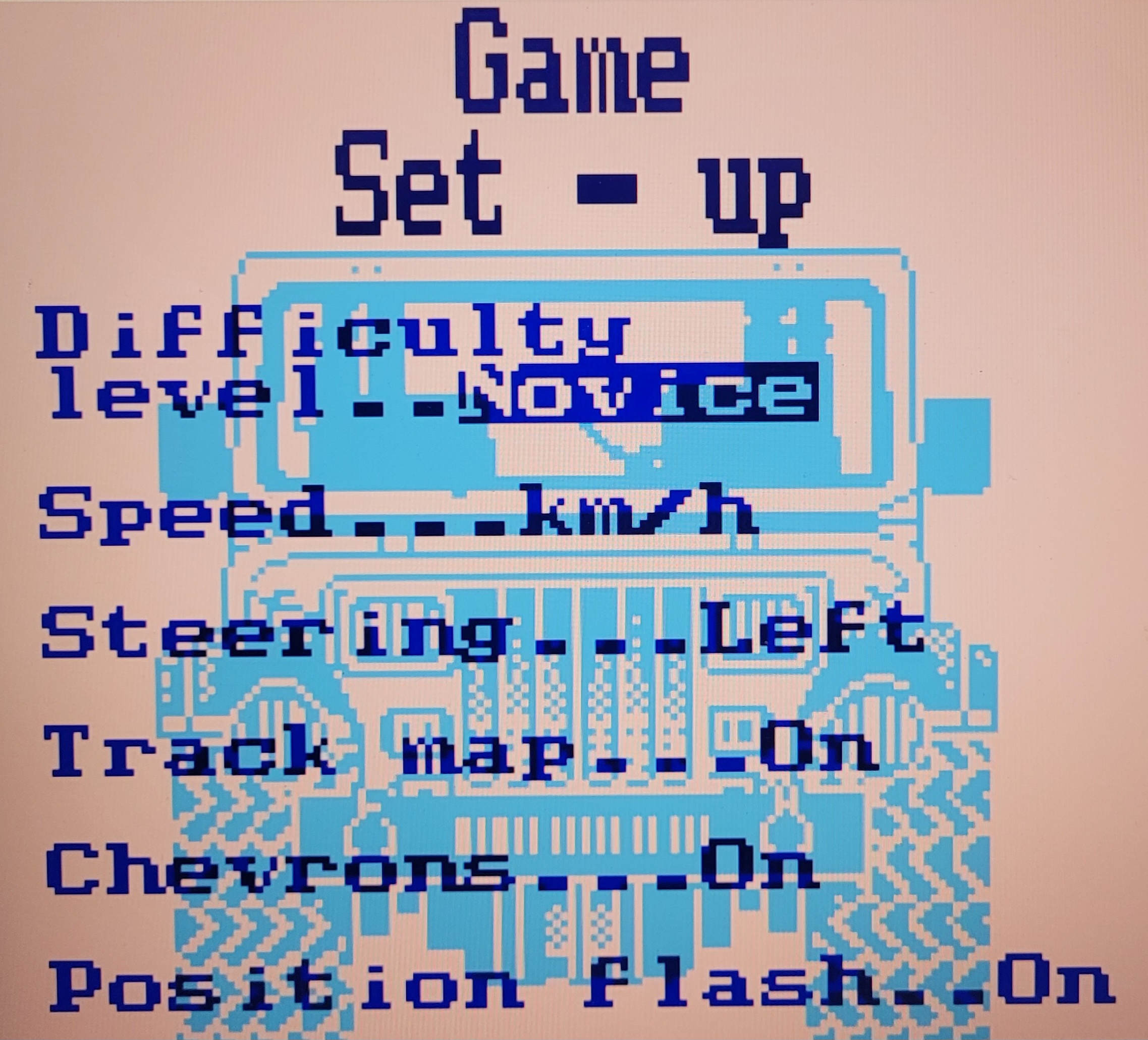 Play the game in 1 player mode with default settings : - Enter your player name. - Difficulty Level : Novice. - Speed (km/h or mph) - Steering (Left or Right) - Track Map (On or Off) - Chevrons (On or Off) - Position Flash (On or Off) Then choose "1 player game", "Practice" and choose the Race you need. INFO : - At the end of each race, the in-game timer don't stop, this is by design in this game... so you need to see the final board to know your records time ! - There's an infinite Turbo on this game, press "Up" to use. |