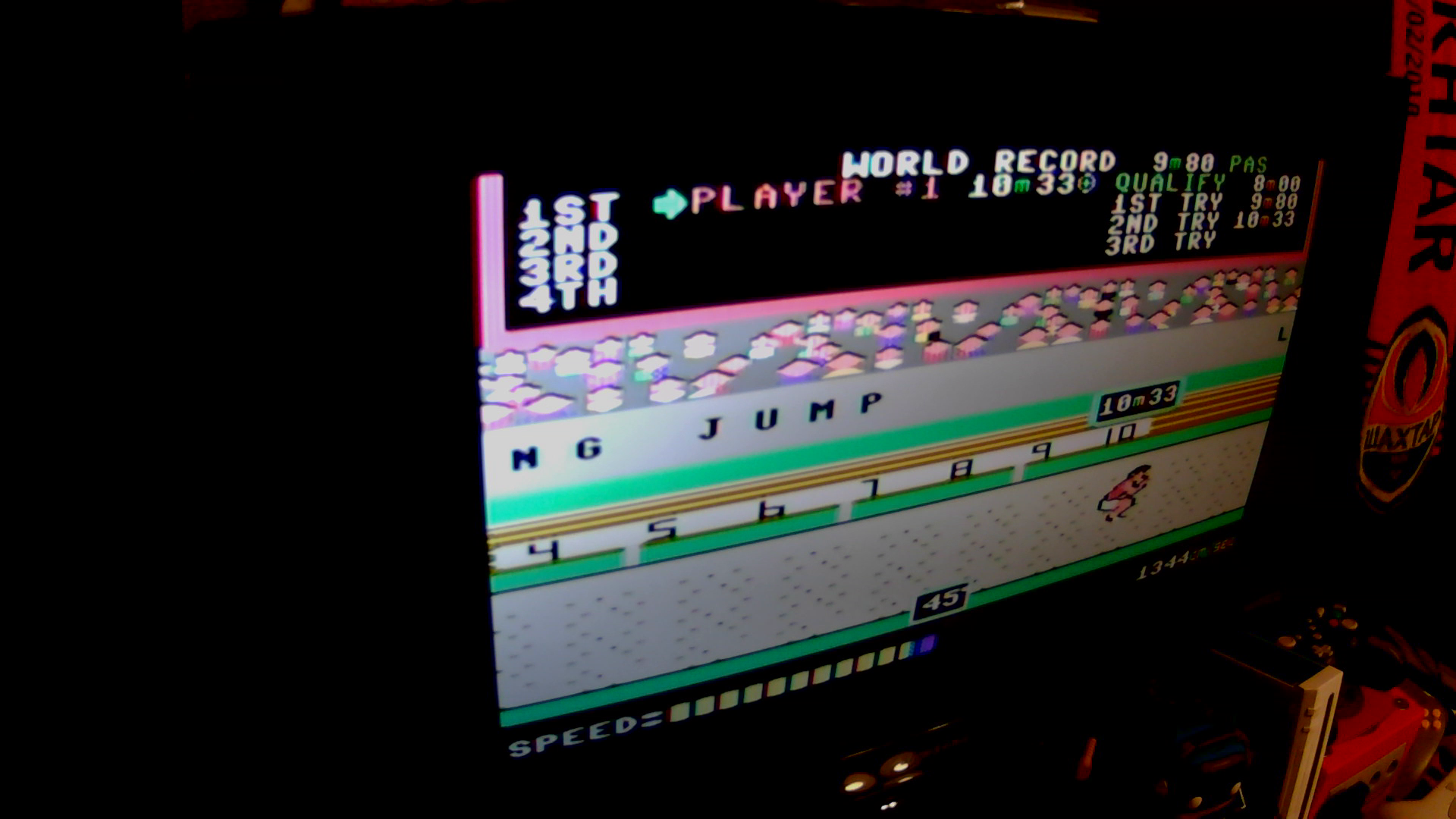 23:42 long jump record 10m33 (second jump)