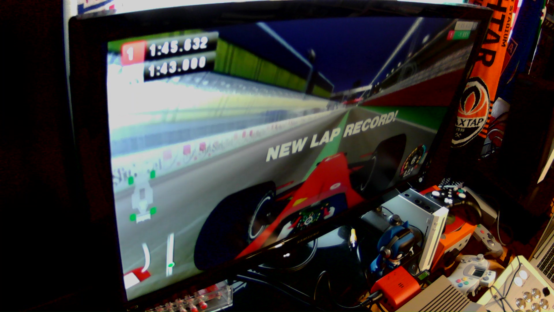 Hardware is in the lower right corner, between Batman-figure and orange GameCube-system.