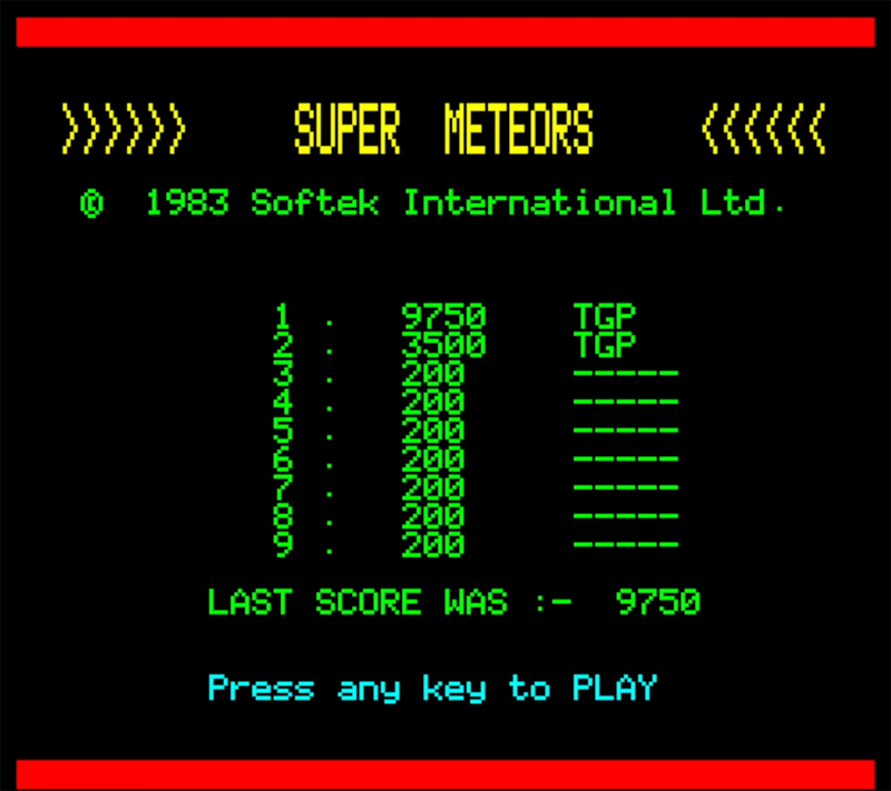 Super Meteors is a 1983 Asteroids-clone arcade game from Softek. It was written by Gordon Russell who also wrote Softek's Galaxians for the Oric. Later moving to the Commodore 64, he wrote Zoids for Softek.