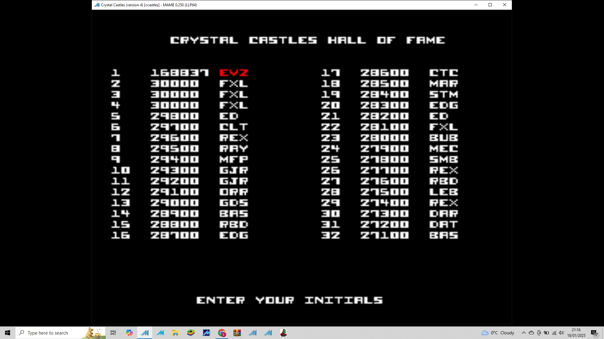 Emulation checked, game checked, gameplay checked, score checked, initials checked.