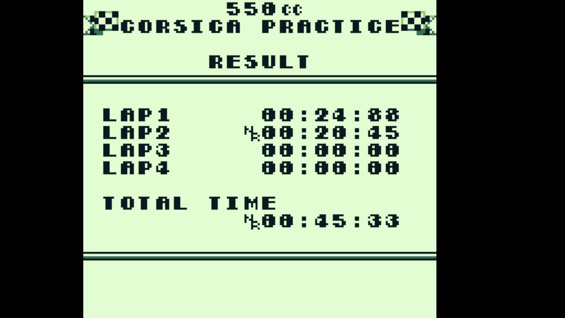 Play the game in 1 player mode with specific settings : - Choose "Practice", then enter your Rider initial, choose "Circuit" then "550cc" and finally, choose the "Circuit". - 550cc = 2 laps by race and 4 circuits (Bahamas / Hawaii / Corsica / Rio ONLY). * EMULATION RECOMMANDATIONS * - Internal clock of following emulators : VBA/VBA-M, SameBoy, RetroArch) is not accurate and for this reason, they are banned on lvlupscore.com -> More informations if needed : http://www.gbrunners.com/game-boy-speedrunning-explained For Top 3, we encourage (and not impose) to provide: - Emulator used (name and version). - Real time FPS (Gameboy FPS is around 59 or 60 fps), because of a leaderboard based on an in-game timer, - A video evidence because of all previously reasons. *ORIGINAL HARDWARE* No specific for now... feel free to contact game-admin if you need. * INFORMATIONS * - This game has an GamePak' battery-backed internal memory. (for saving the records) |