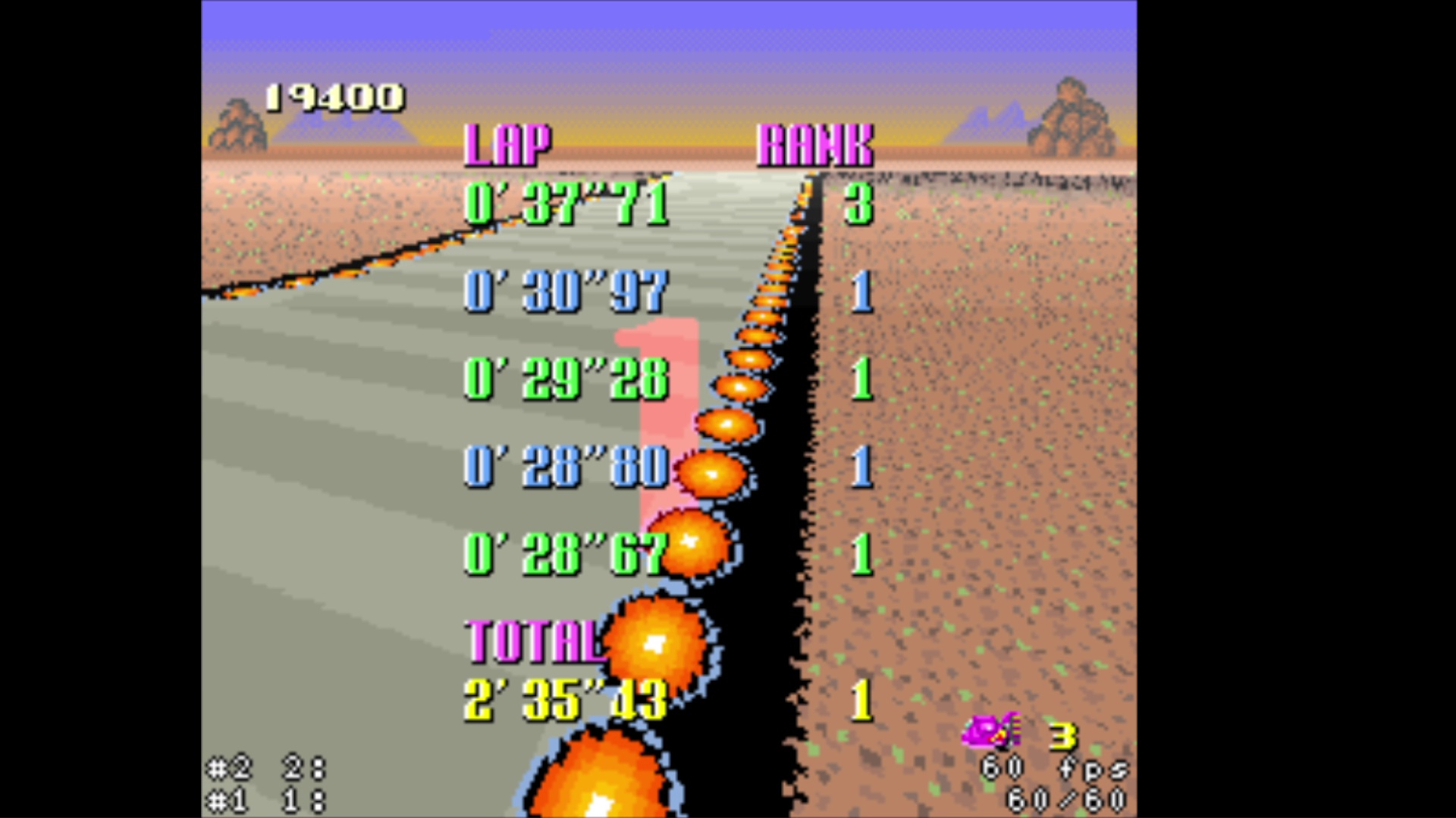 • zsnes (all versions) and snes9x emulators <=1.53 banned because inaccuracy in timing • super start allowed (pushed by other cars at start) • shortcuts allowed • practice mode: rival allowed • for best lap : use of 4 boosts on same lap allowed (1 just before the finish line on 4th lap and 3 others on last lap) • records menu is a mix of gp and practice time (pink = practice / blue = GP) • try again is allowed (3 lives = 3 retries maximum) • use of pause when the timer is started is forbidden • use of turbo button controller is forbidden |