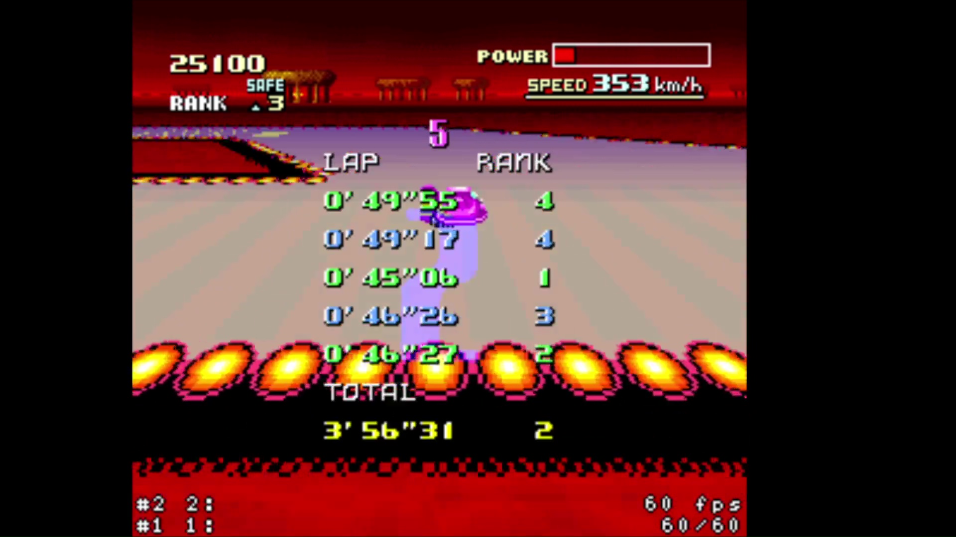 • zsnes (all versions) and snes9x emulators <=1.53 banned because inaccuracy in timing • super start allowed (pushed by other cars at start) • shortcuts allowed • practice mode: rival allowed • for best lap : use of 4 boosts on same lap allowed (1 just before the finish line on 4th lap and 3 others on last lap) • records menu is a mix of gp and practice time (pink = practice / blue = GP) • try again is allowed (3 lives = 3 retries maximum) • use of pause when the timer is started is forbidden • use of turbo button controller is forbidden |