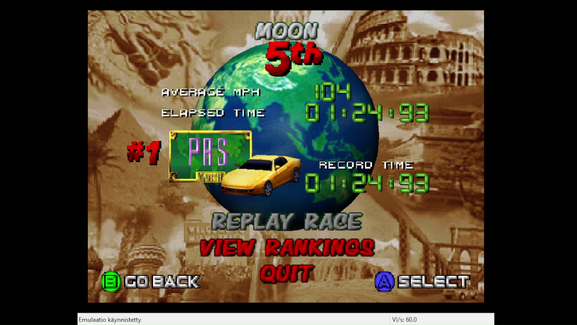 Emulation checked, game checked, Easy / Cruise the World / Track checked, gameplay checked, time checked, initials checked.