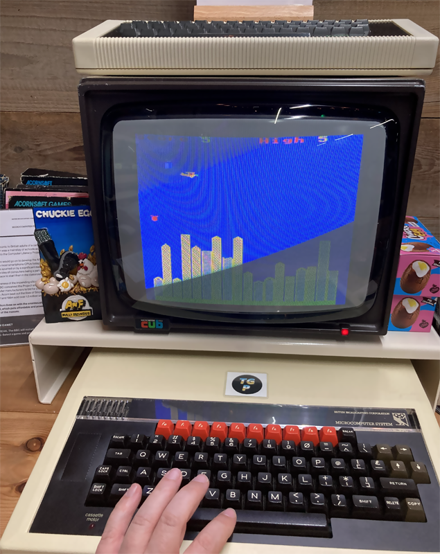 This game was played at the Retro Collective, Stroud, UK on the 4th October 2025, on their BBC Micro - there is an Acorn Atom sat on top of the monitor. There are no selectable skill levels in the game. The final score was 459 points.