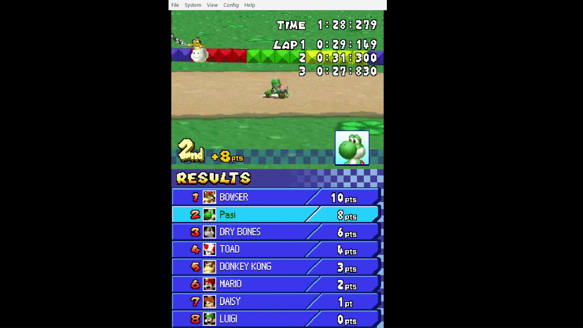Emulation checked, game checked, Grand Prix / 150cc Mirror / Track checked, gameplay checked, time checked.