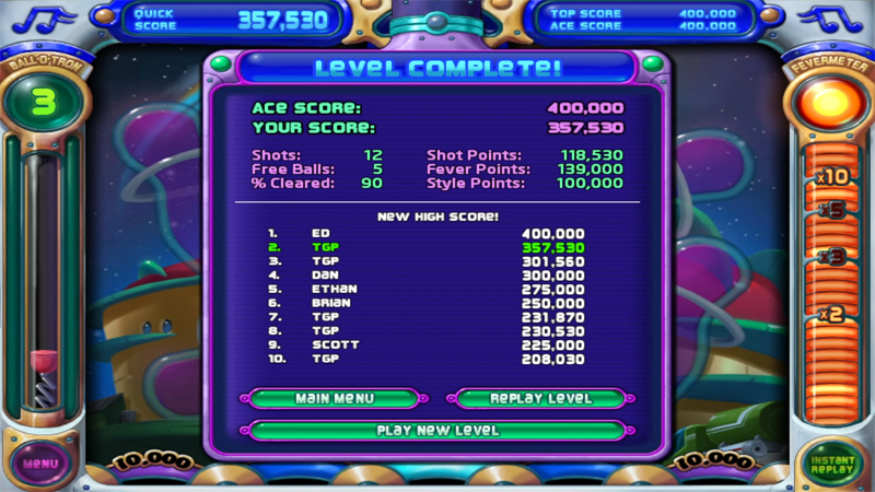 02:17 Super Long Shot! - 50,000 points. Last target peg hit. 100,000 point bonus scored. Final score 357,530 points.