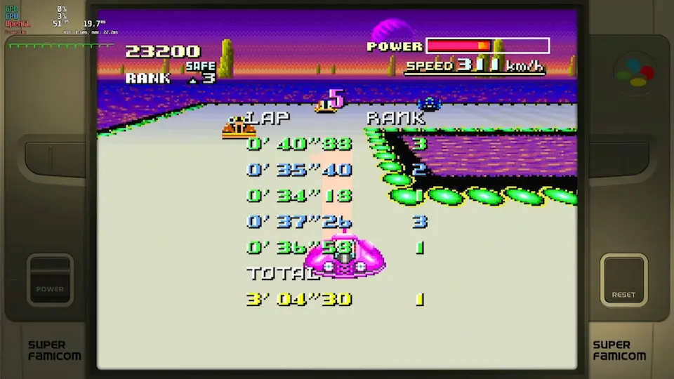 • zsnes (all versions) and snes9x emulators <=1.53 banned because inaccuracy in timing • super start allowed (pushed by other cars at start) • shortcuts allowed • practice mode: rival allowed • for best lap : use of 4 boosts on same lap allowed (1 just before the finish line on 4th lap and 3 others on last lap) • records menu is a mix of gp and practice time (pink = practice / blue = GP) • try again is allowed (3 lives = 3 retries maximum) • use of pause when the timer is started is forbidden • use of turbo button controller is forbidden |