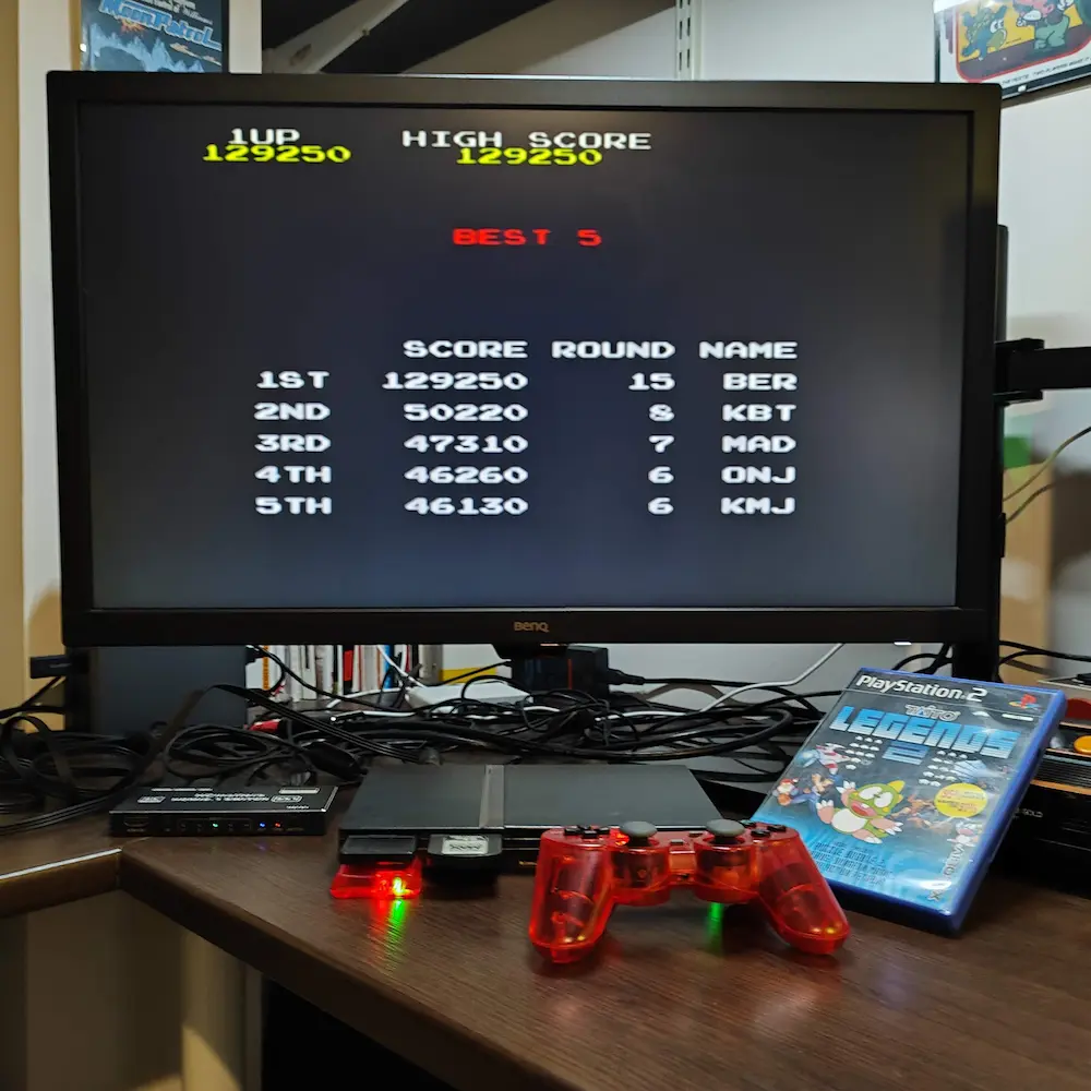 Hardware checked, game checked, 3 lives = Normal checked, gameplay checked, score checked, initials checked.