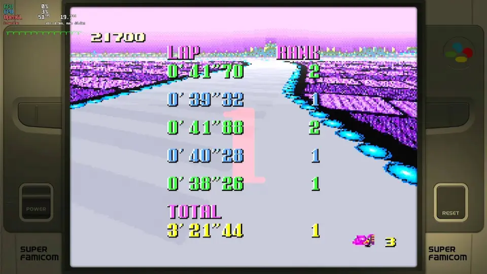 • zsnes (all versions) and snes9x emulators <=1.53 banned because inaccuracy in timing • super start allowed (pushed by other cars at start) • shortcuts allowed • practice mode: rival allowed • for best lap : use of 4 boosts on same lap allowed (1 just before the finish line on 4th lap and 3 others on last lap) • records menu is a mix of gp and practice time (pink = practice / blue = GP) • try again is allowed (3 lives = 3 retries maximum) • use of pause when the timer is started is forbidden • use of turbo button controller is forbidden |