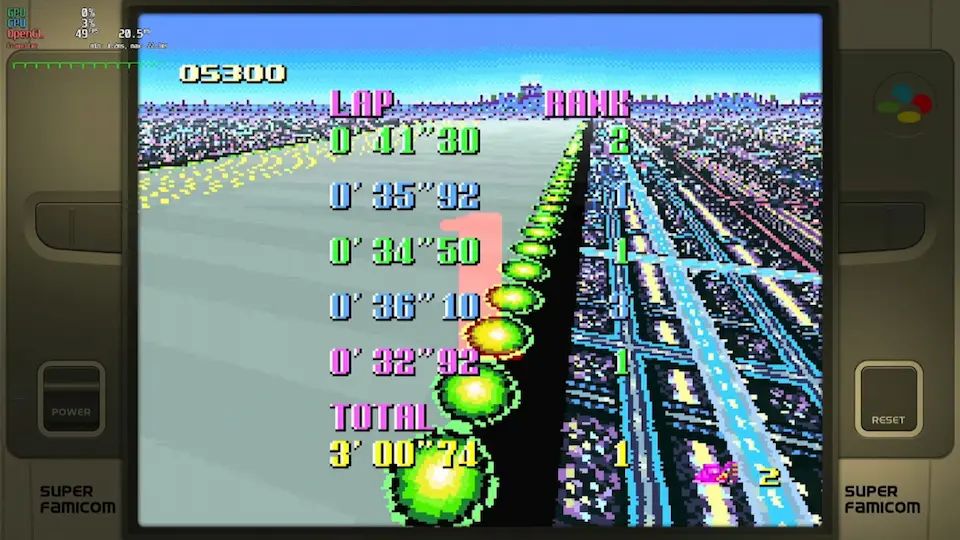 • zsnes (all versions) and snes9x emulators <=1.53 banned because inaccuracy in timing • super start allowed (pushed by other cars at start) • shortcuts allowed • practice mode: rival allowed • for best lap : use of 4 boosts on same lap allowed (1 just before the finish line on 4th lap and 3 others on last lap) • records menu is a mix of gp and practice time (pink = practice / blue = GP) • try again is allowed (3 lives = 3 retries maximum) • use of pause when the timer is started is forbidden • use of turbo button controller is forbidden |
