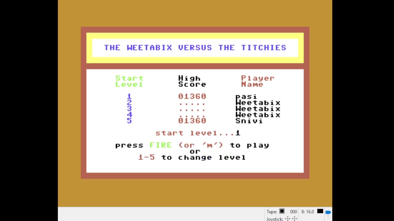 Play on any emulator or FPGA. Includes 'The C64' Mini and Maxi. PAL or NTSC model allowed except for games having a timing issue. If so, please post in PAL or NTSC category (i.e. Outrun,...). Play with default settings unless otherwise specified. No use of trainers, cheats, saved game files, auto-fire (when not default present in-game), emulator save states, or other emulator advantages. No use of code modifications that give the player an advantage over other players. 1 player only. No continues. It is discouraged and may lead to voters not accepting your score to: - excessively point farm - use glitches or other game exploits |