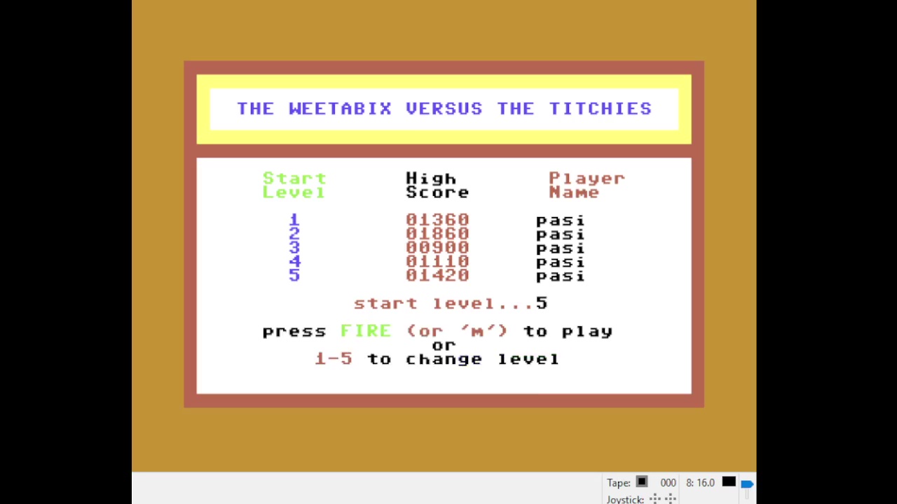 Play on any emulator or FPGA. Includes 'The C64' Mini and Maxi. PAL or NTSC model allowed except for games having a timing issue. If so, please post in PAL or NTSC category (i.e. Outrun,...). Play with default settings unless otherwise specified. No use of trainers, cheats, saved game files, auto-fire (when not default present in-game), emulator save states, or other emulator advantages. No use of code modifications that give the player an advantage over other players. 1 player only. No continues. It is discouraged and may lead to voters not accepting your score to: - excessively point farm - use glitches or other game exploits |
