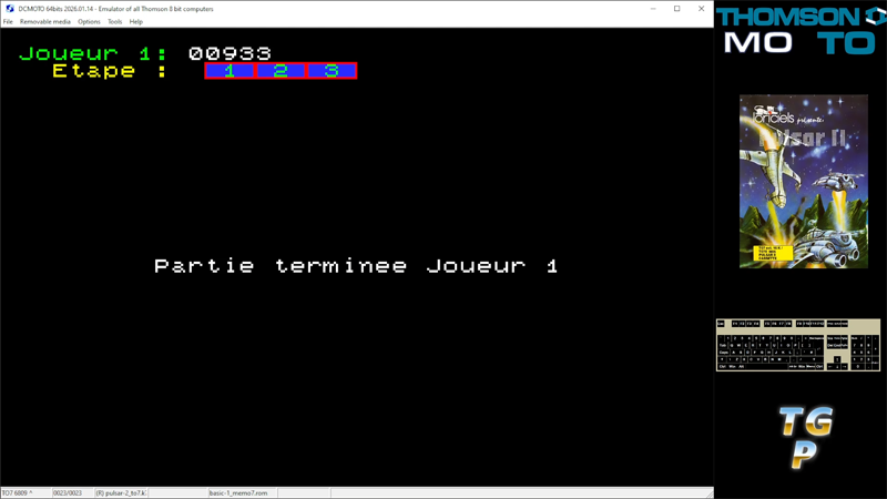 This run was made on the 26th March 2026. The game has no skill levels and was played on a Thomson TO7, using the DCMOTO emulator. The skill level selected was Normal (half way between Facile and Difficile) and the final score was 933 points.