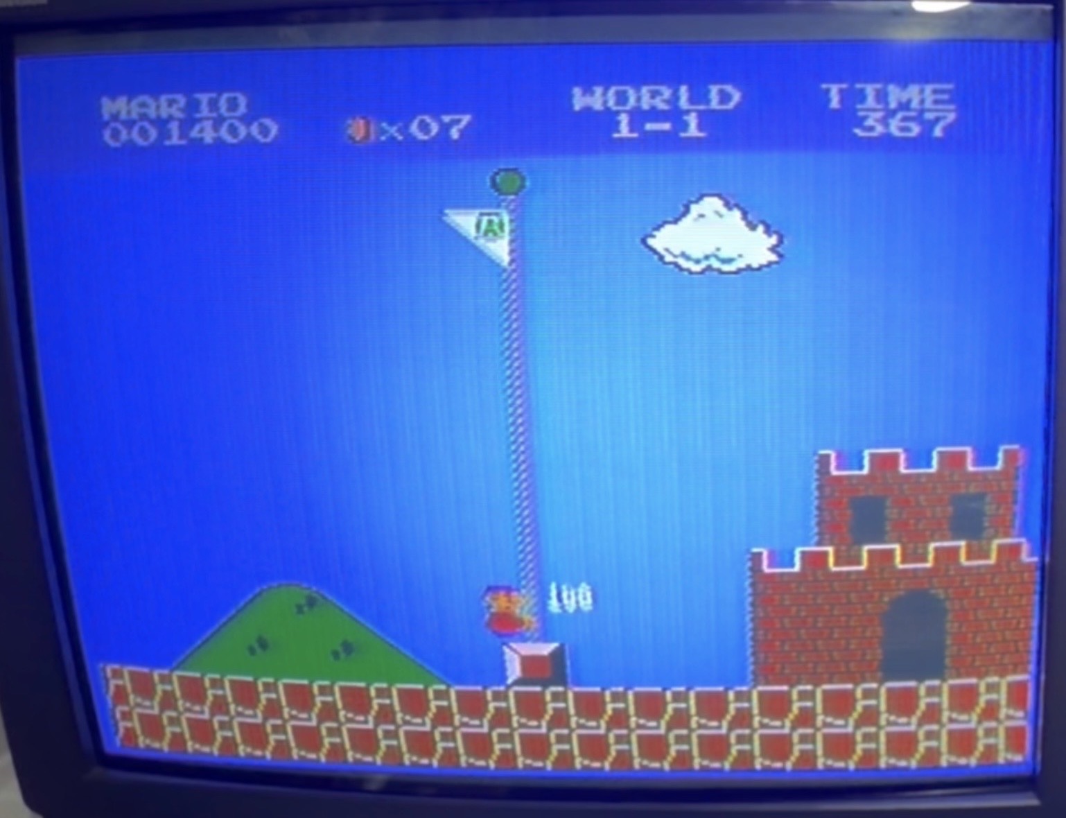 Score is based on time left on in-game timer (higher is better) when Mario touches the flagpole– which is at 0:22