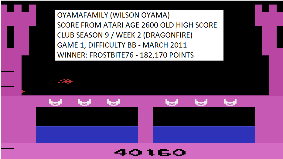 Game 1-1: ∙ One player ∙ Start on Dragon #1 - Green dragon ("Green and mean, but slow") ⏪ Left difficulty switch setting must remain in the position indicated by the leaderboard category: 🅰 Faster dragon fire 🅱 Slower dragon fire ⏩ Right difficulty switch setting has no effect in a one-player variation, and can therefore be in any position at any time. 🔄 Rollover: 1,000,000 ✒️ Robert G. Smith ©️ Imagic 🗓 1982 F 10.16.24 |