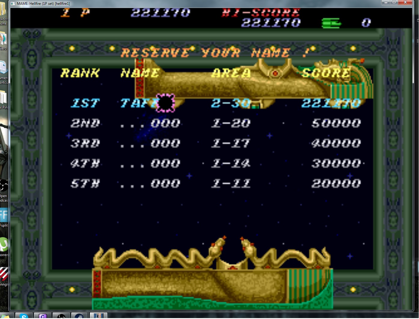 Play with default settings unless otherwise specified. If the ROM set is not mentioned, play the parent ROM. No use of trainers, cheats, saved game files, emulator save states or other emulator advantages. No use of code modifications that give the player an advantage over other players. 1 player only. No continues. In-game/internal autofire is only allowed if a game has it (enabled through hard or soft DIPs). External/MAME/cheat-based autofire is not allowed. It is discouraged and may lead to voters not accepting your score to - excessively point farm - use glitches or other game exploits You can use any emulator you want (Retropie, rain, neo geo, Coinops, Antstream, handhelds,...). If specific emulators or versions are restricted, it will be mentioned in the Specific rules. For Top 3 we encourage (but NOT mandatory) to provide: a) A full video with DIP Switches to be shown in the video (at the start or at the end of your performance). If DIP Switches are not available, Service Menu should be used instead (at the start of your performance). If no difficulty settings is available on your game, you still have to show either DIP switches or service mode showing this (if not mentioned in the specific rules). OR b) An INP file. Please state your MAME version in the comments. And add an URL where the voter can download your .inp. (We currently have no way to store those files on the server, but it is on the roadmap). For INPs: o We encourage to also show the DIPs during your video play. o Delete NVRAM before recording/viewing. Many arcade games that MAME emulates save some information (like high scores) in non-volatile ram (NVRAM), which by default MAME saves in the nvram subfolder. For some games (not all) the RNG is affected by NVRAM, so an .inp file recorded with non-empty nvram won't replay correctly on anyone else's system. o To record INP file, you require Wolfmame: You can download it here : https://github.com/mahlemiut/wolfmame/releases (or on MARP). o Record one run gameplay when using INP. |