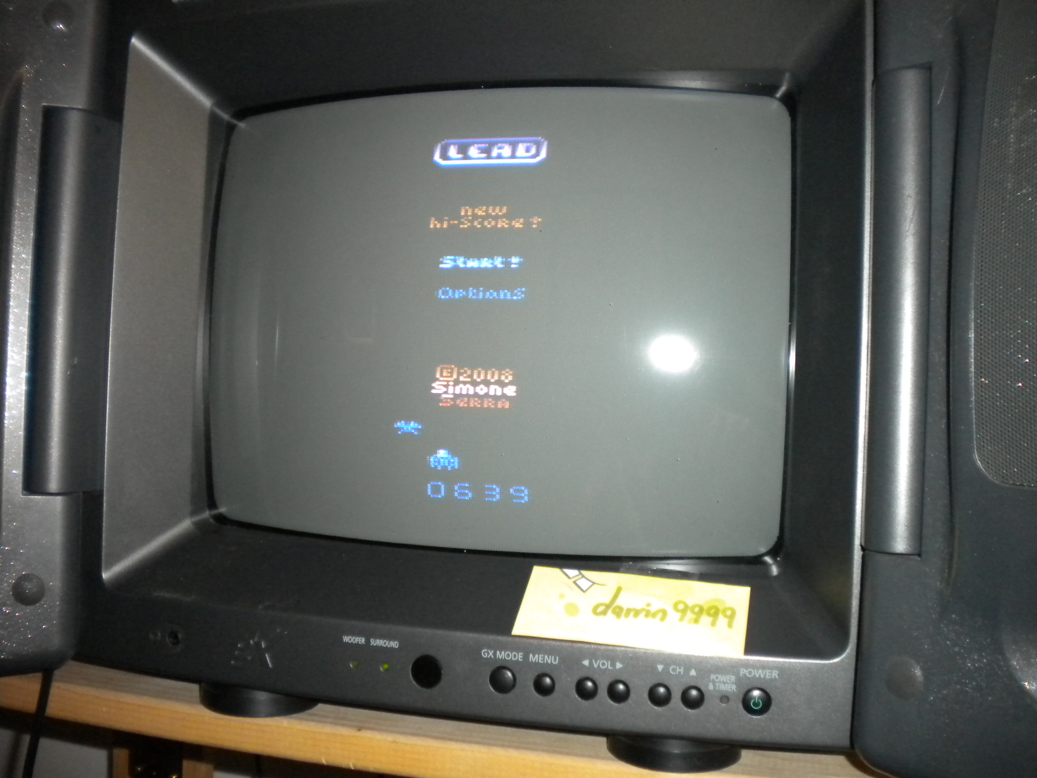 From the options menu*: β Fx: ANY setting β Speed: ANY setting β Rhythm: ANY setting β Envelope: ANY setting β Select the "Lead 1K" version β Enemies are worth 1 point each * Option screen available on 8K and 16K version ROMs Left difficulty switch was intended to function as a smart bomb safety function to prevent inadvertent smart bomb activation, however, it does not seem to have any effect, and can therefore be in any position at any time. Right difficulty switch setting has no effect in this title, and can therefore be in any position at any time. Homebrew author: Simone Serra (a.k.a. "Seemo") Released: 2008 πΉ ROMs were publicly released by their author, and can be obtained here: Lead 1K (ROM size = 4K) πΎ https://atariage.com/forums/topic/108514-lead/ β Has only the 1K version Lead 4K πΎ https://atariage.com/forums/topic/108514-lead/?do=findComment&comment=1447424 β ROM size = 8K, file "lead_8k_final.bin" β ROM version allows you to select the 1K or 4K version β 4K version is the default Lead 16K πΎ https://atariage.com/forums/topic/108514-lead/?do=findComment&comment=1584266 β ROM version allows you to select the 1K, 4K or 16K version β 16K version is the default |