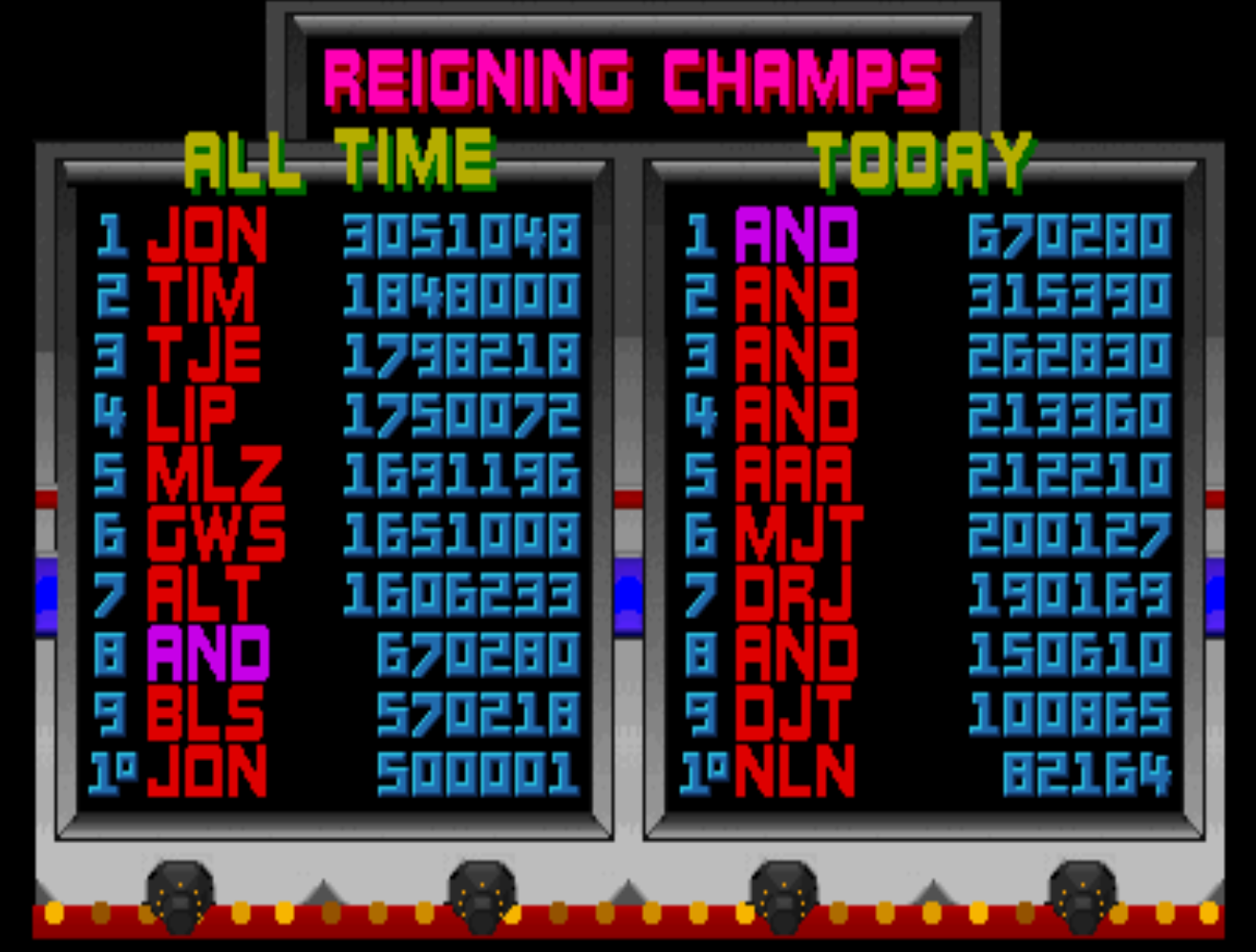 Play with default settings unless otherwise specified. If the ROM set is not mentioned, play the parent ROM. No use of trainers, cheats, saved game files, emulator save states or other emulator advantages. No use of code modifications that give the player an advantage over other players. 1 player only. No continues. In-game/internal autofire is only allowed if a game has it (enabled through hard or soft DIPs). External/MAME/cheat-based autofire is not allowed. It is discouraged and may lead to voters not accepting your score to - excessively point farm - use glitches or other game exploits You can use any emulator you want (Retropie, rain, neo geo, Coinops, Antstream, handhelds,...). If specific emulators or versions are restricted, it will be mentioned in the Specific rules. For Top 3 we encourage (but NOT mandatory) to provide: a) A full video with DIP Switches to be shown in the video (at the start or at the end of your performance). If DIP Switches are not available, Service Menu should be used instead (at the start of your performance). If no difficulty settings is available on your game, you still have to show either DIP switches or service mode showing this (if not mentioned in the specific rules). OR b) An INP file. Please state your MAME version in the comments. And add an URL where the voter can download your .inp. (We currently have no way to store those files on the server, but it is on the roadmap). For INPs: o We encourage to also show the DIPs during your video play. o Delete NVRAM before recording/viewing. Many arcade games that MAME emulates save some information (like high scores) in non-volatile ram (NVRAM), which by default MAME saves in the nvram subfolder. For some games (not all) the RNG is affected by NVRAM, so an .inp file recorded with non-empty nvram won't replay correctly on anyone else's system. o To record INP file, you require Wolfmame: You can download it here : https://github.com/mahlemiut/wolfmame/releases (or on MARP). o Record one run gameplay when using INP. |