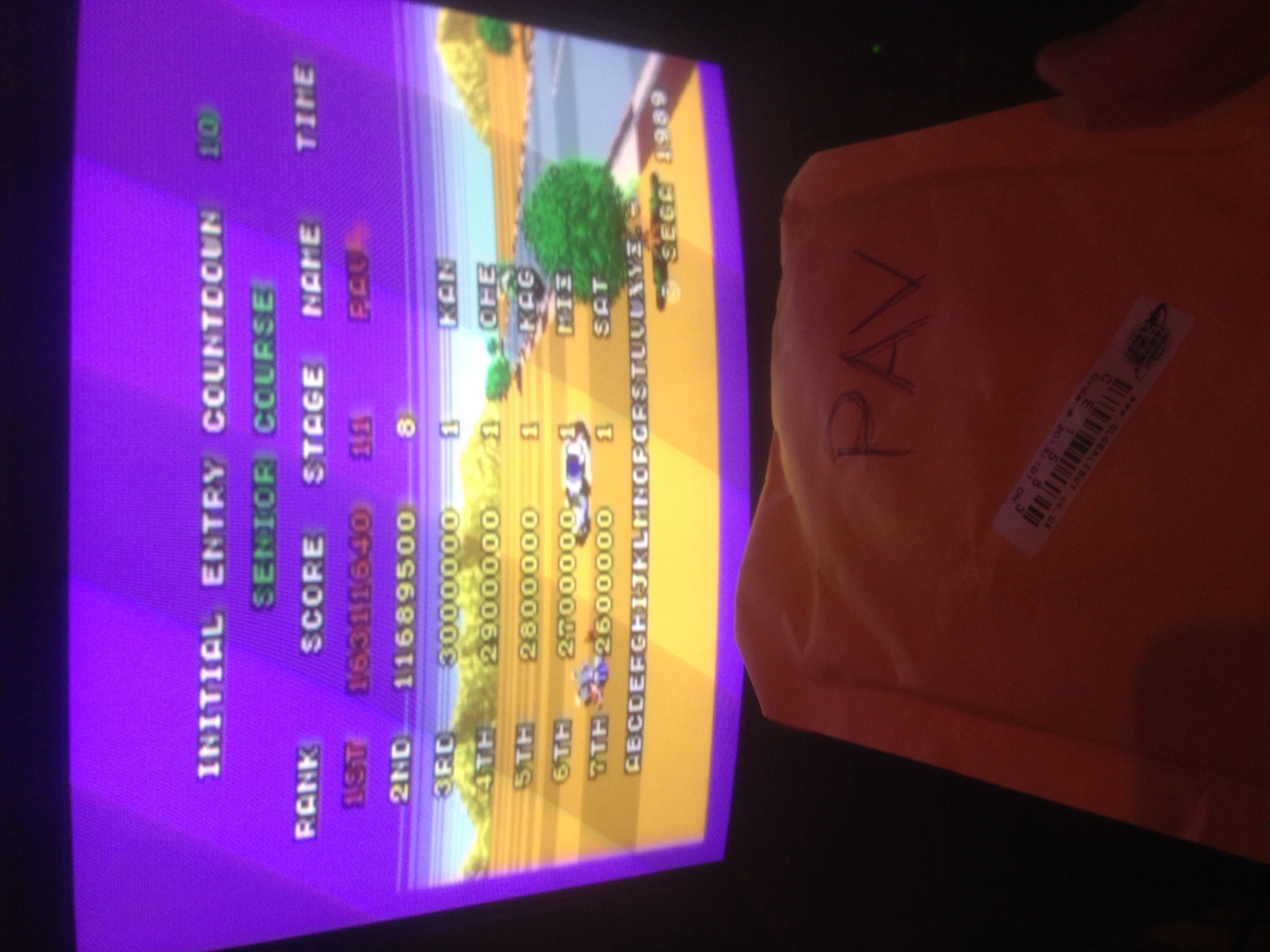 Play the game in 1 player mode with default settings: Normal settings on difficulty and time limit.. (On the title screen, hold A + B + C. An Options screen will appear that allows you to choose the difficulty, time limit, and language. A sound test item will also appear.) Easy / Normal (Default) / Hard / Hardest) The game may be played using either the original cartridge, the Triple Score cartridge, or the 6-Pak cartridge. |