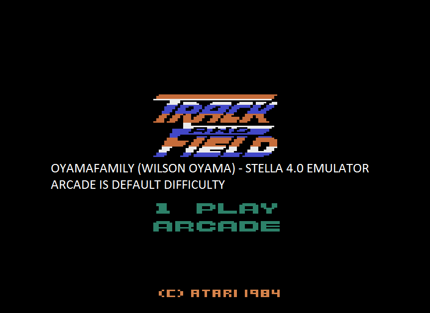 🕹 Player may use any controller. ⚙️ Game ARCADE ∙ Standard qualifying distances, speeds, and heights. ∙ Total score after all events. ⏪ Left difficulty switch setting has no effect in this title, and can therefore be in any position at any time. ⏩ Right difficulty switch setting has no effect in this title, and can therefore be in any position at any time. 🔄 Rollover: N/A (impossible) ✒️ Seth Lipkin, Jaques Hugon, and Allen Wells (GCC) ©️ Atari 🗓 1984 F 12.28.24 |