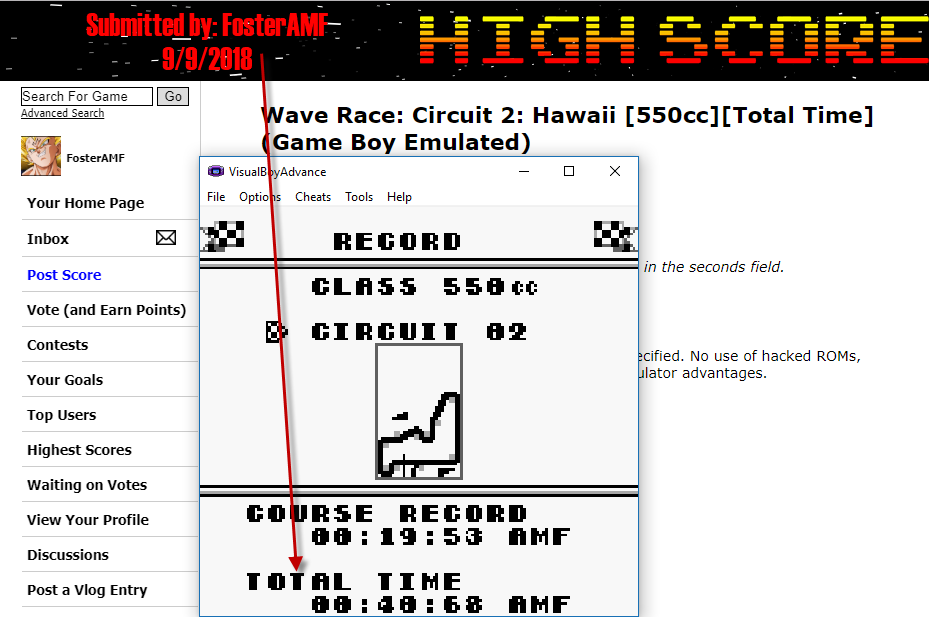 Play the game in 1 player mode with specific settings : - Choose "Practice", then enter your Rider initial, choose "Circuit" then "550cc" and finally, choose the "Circuit". - 550cc = 2 laps by race and 4 circuits (Bahamas / Hawaii / Corsica / Rio ONLY). * EMULATION RECOMMANDATIONS * - Internal clock of following emulators : VBA/VBA-M, SameBoy, RetroArch) is not accurate and for this reason, they are banned on lvlupscore.com -> More informations if needed : http://www.gbrunners.com/game-boy-speedrunning-explained For Top 3, we encourage (and not impose) to provide: - Emulator used (name and version). - Real time FPS (Gameboy FPS is around 59 or 60 fps), because of a leaderboard based on an in-game timer, - A video evidence because of all previously reasons. *ORIGINAL HARDWARE* No specific for now... feel free to contact game-admin if you need. * INFORMATIONS * - This game has an GamePak' battery-backed internal memory. (for saving the records) |