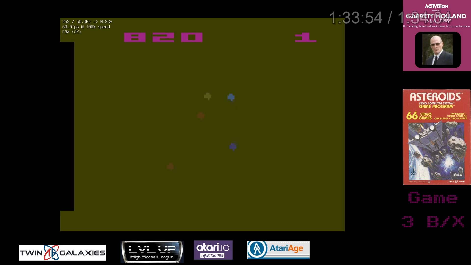 Game 3: β Slow speed β Extra life every 10,000 β Hyperspace Left difficulty switch setting must remain in the position indicated by the leaderboard category. A/Expert: UFOs B/Novice: No UFOs Right difficulty switch setting has no effect in a one-player variation, and can therefore be in any position at any time. There is a rare glitch that awards a player between 4,000 and 6,000 points for striking a single object. There is no known way to cause this glitch intentionally. β Scores achieved that include this glitch are ALLOWED. Two versions of Asteroids were released. One version with the copyright screen intro, and one without. β Player may use either version. A 4.2.22 |