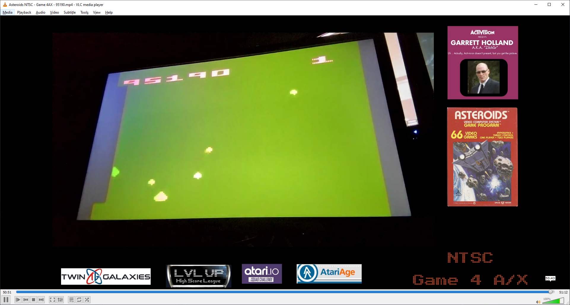 Game 4: β Fast speed β Extra life every 10,000 β Hyperspace Left difficulty switch setting must remain in the position indicated by the leaderboard category. A/Expert: UFOs B/Novice: No UFOs Right difficulty switch setting has no effect in a one-player variation, and can therefore be in any position at any time. There is a rare glitch that awards a player between 4,000 and 6,000 points for striking a single object. There is no known way to cause this glitch intentionally. β Scores achieved that include this glitch are ALLOWED. Two versions of Asteroids were released. One version with the copyright screen intro, and one without. β Player may use either version. A 4.2.22 |