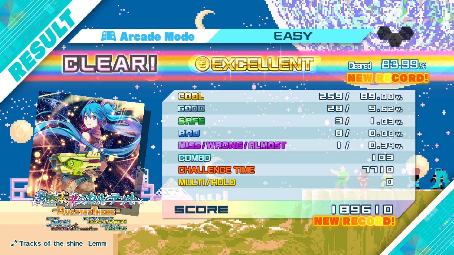 Hardware assumed, game checked, Arcade mode checked, Easy difficulty checked, track checked, gameplay checked, score checked.