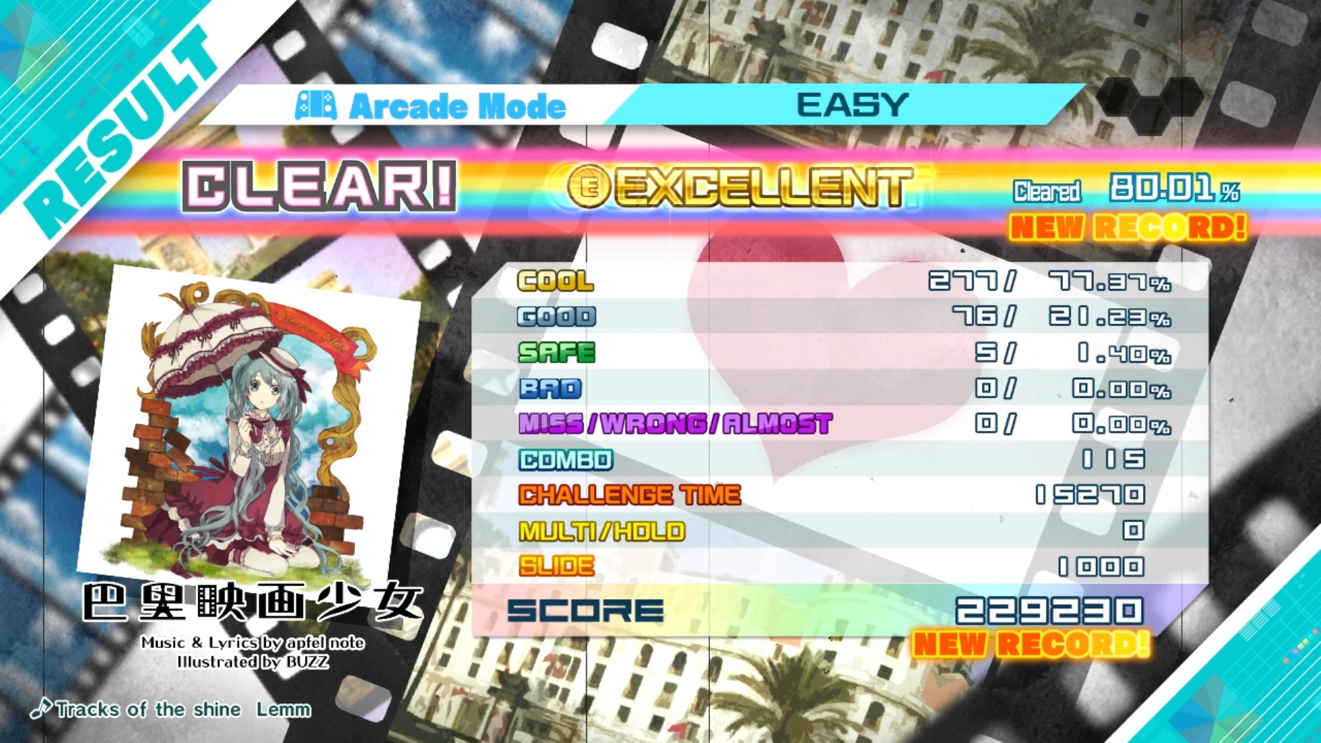 Hardware assumed, game checked, Arcade mode checked, Easy difficulty checked, track checked, gameplay checked, score checked.