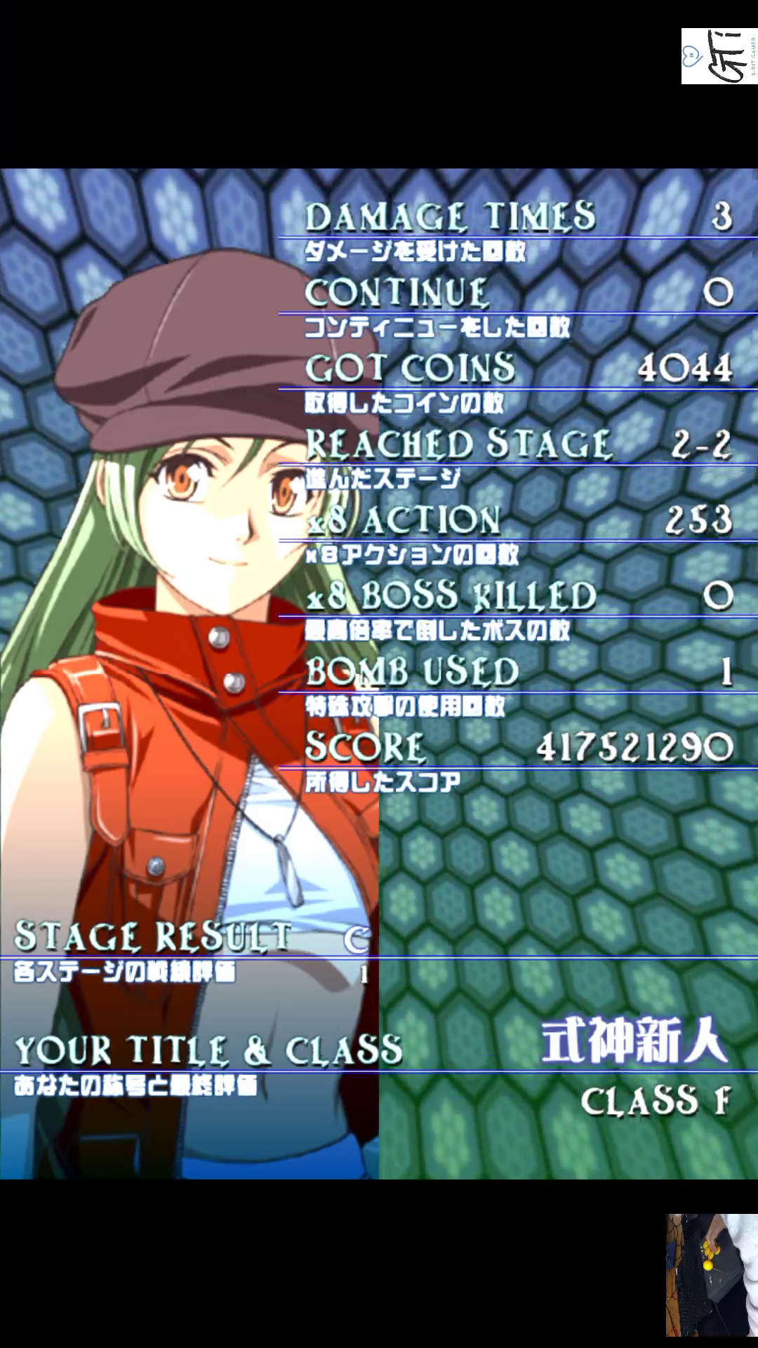 Play the game in 1 player mode with default settings. (No DIPs to show; You can see the settings on the title screen) Life Charge: Rank 3 Difficulty: Rank 3 C-Button Rapid: OFF Choose any character you want. |