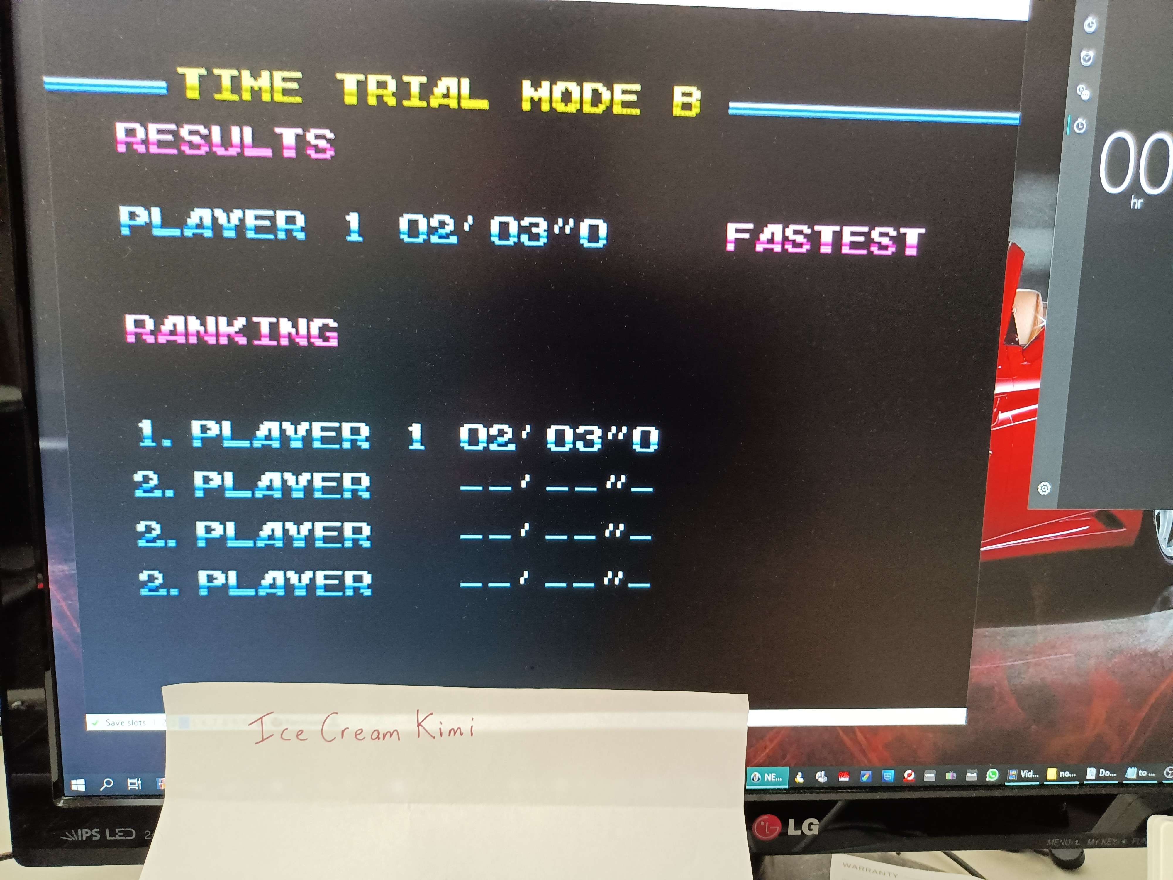 Emulation checked, game checked, Mode B / 2 laps / 10 points checked, track checked, gameplay checked, time checked.