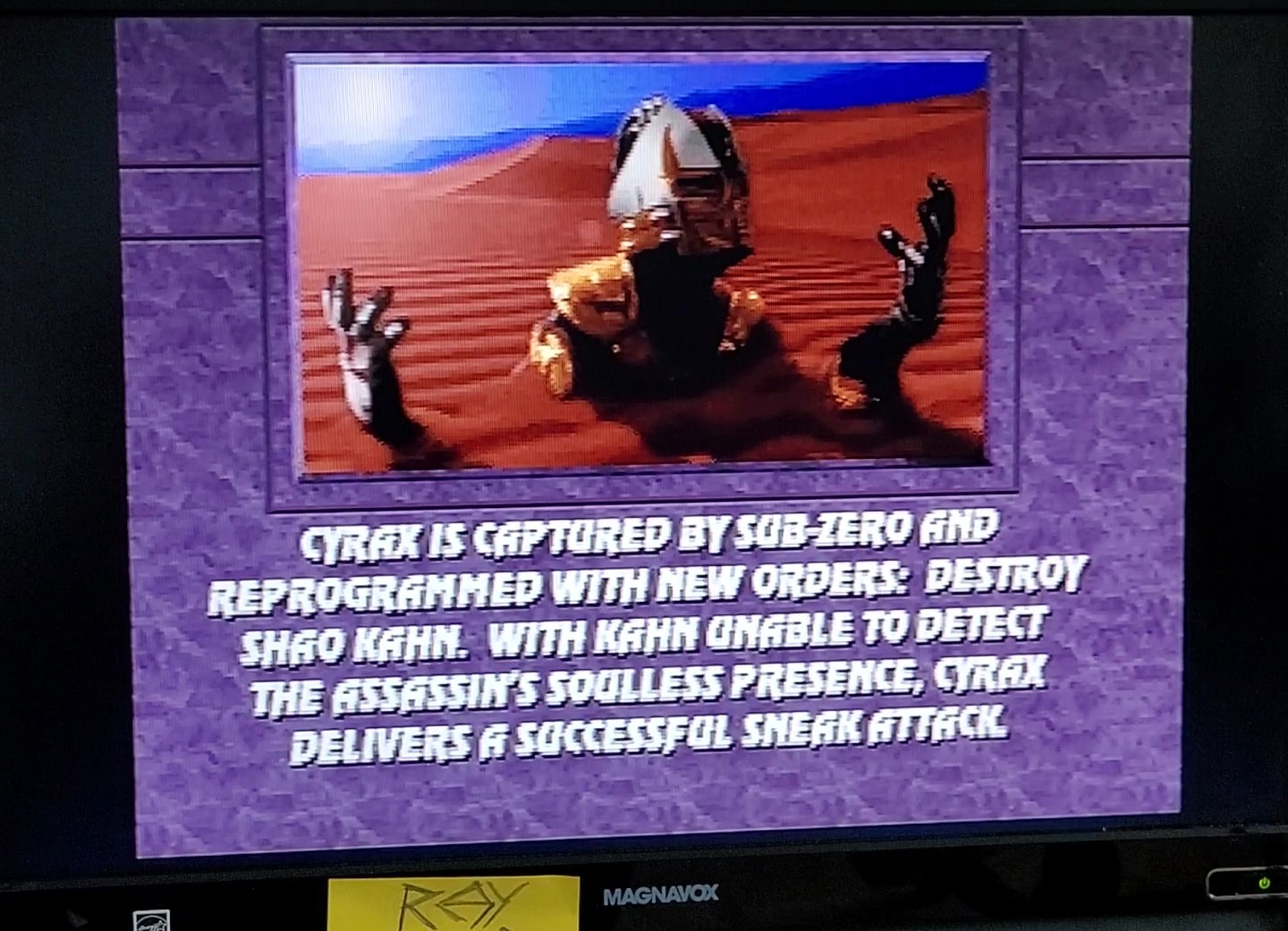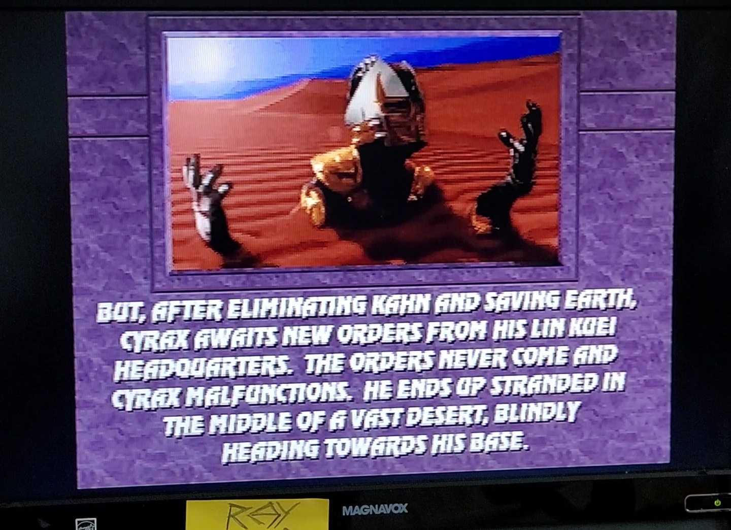 In Ultimate MK3 this ending is in one of the stage backgrounds, Cyrax malfunctioning stuck in the sand.