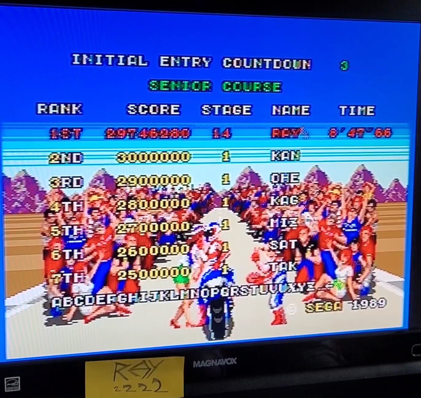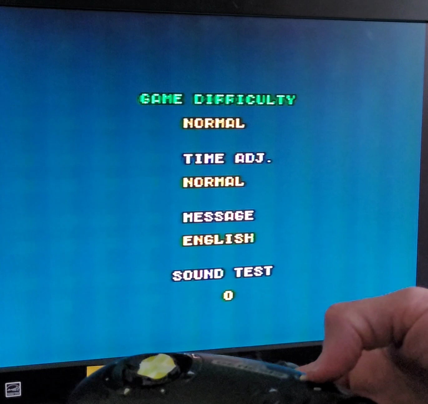 Play the game in 1 player mode with default settings: Normal settings on difficulty and time limit.. (On the title screen, hold A + B + C. An Options screen will appear that allows you to choose the difficulty, time limit, and language. A sound test item will also appear.) Easy / Normal (Default) / Hard / Hardest) The game may be played using either the original cartridge, the Triple Score cartridge, or the 6-Pak cartridge. |