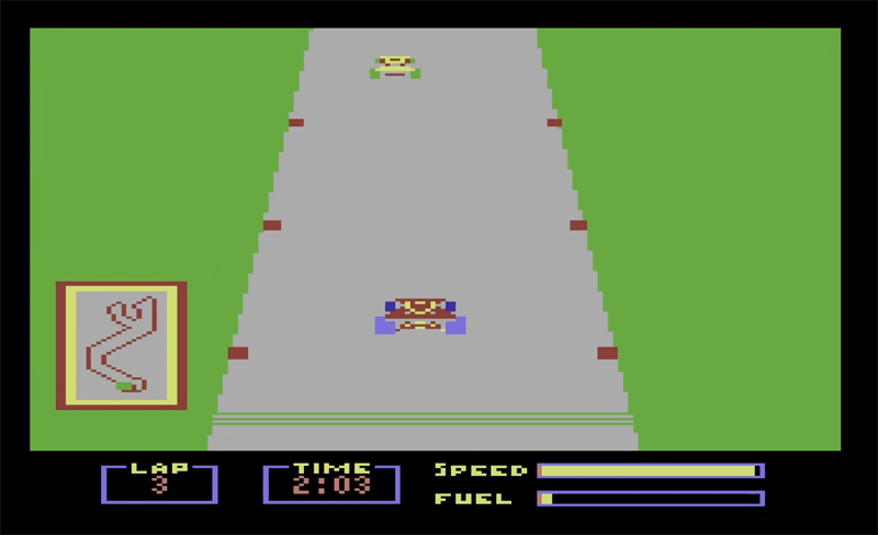 The race itself is similar to Pole Position, though it looks more basic. The track twists left and right according to the track map at bottom left. Other drivers are present which should be avoided, as should the edge of the track. Your fuel ticks down and the tyres wear out, as indicated by their colour.