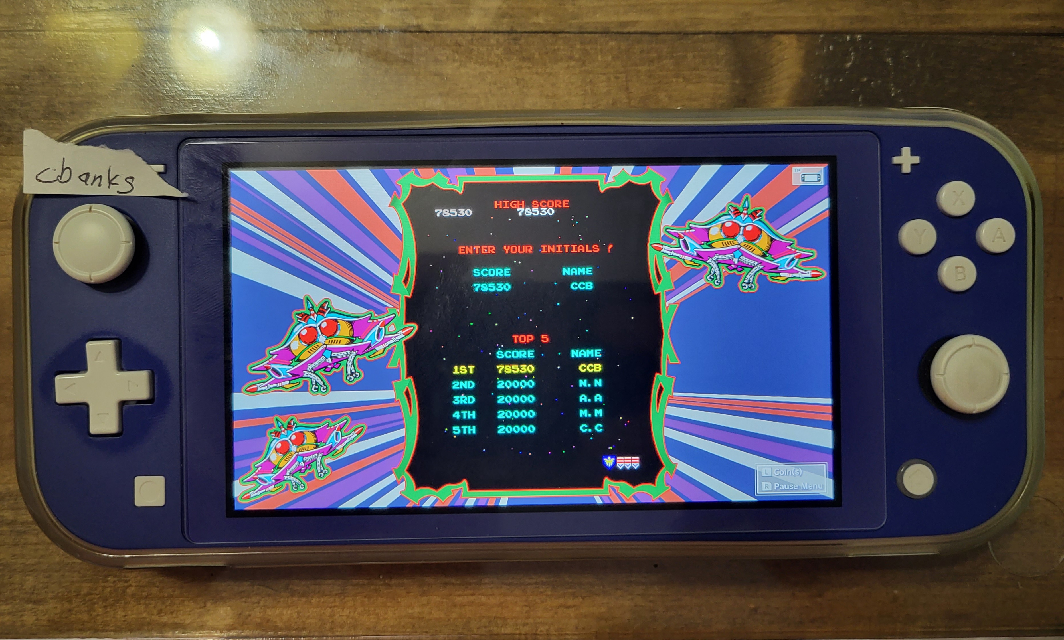 Hardware checked, game checked, score checked, player initials and name checked.
