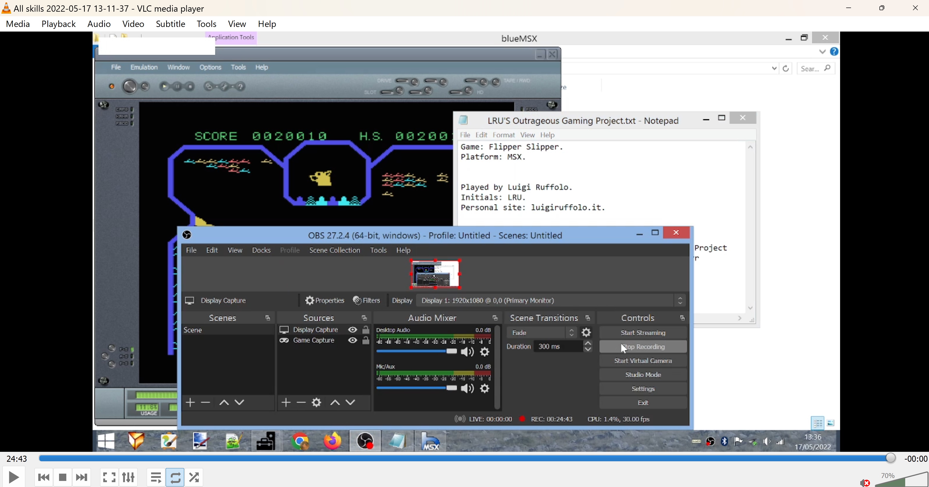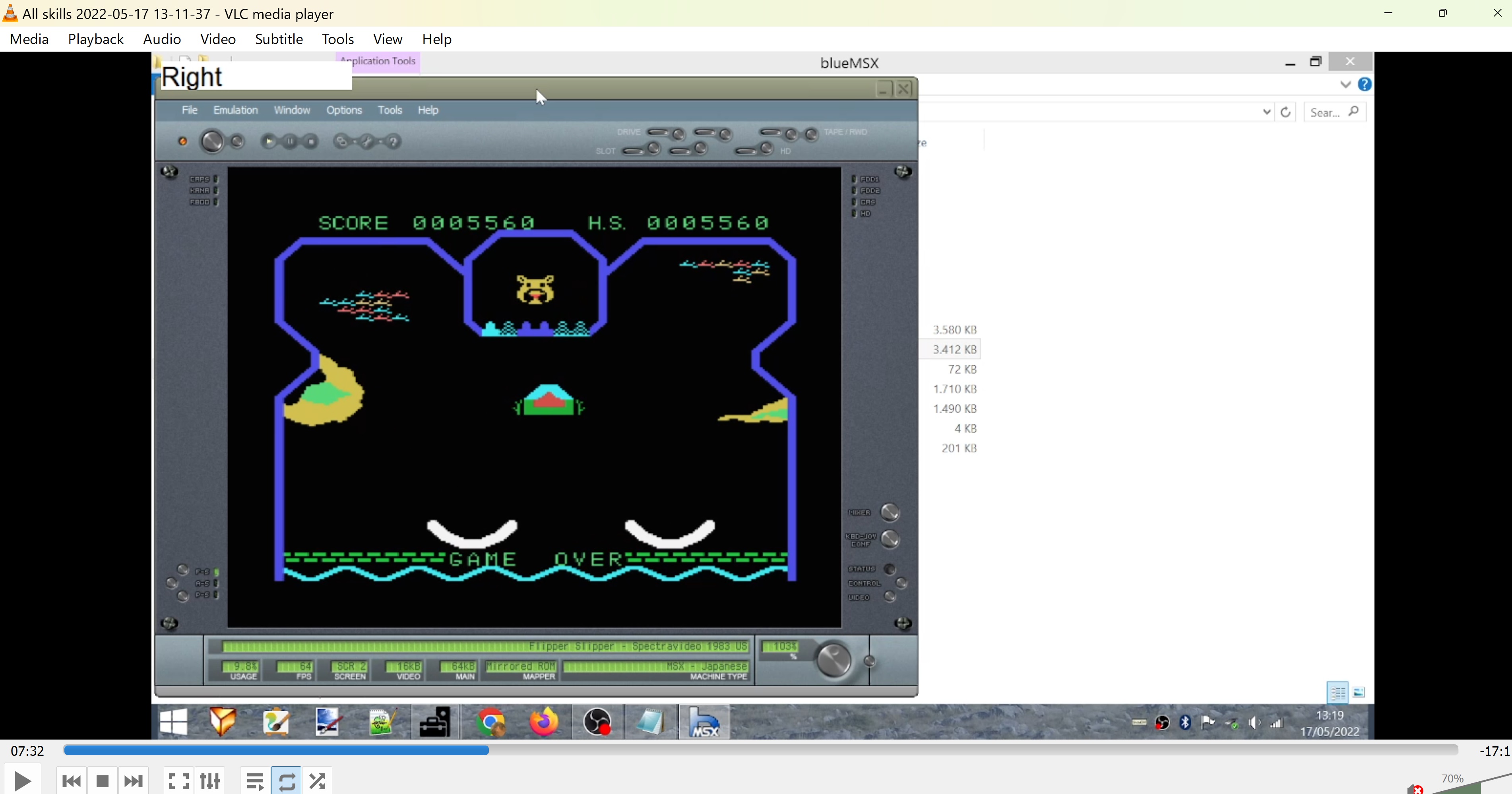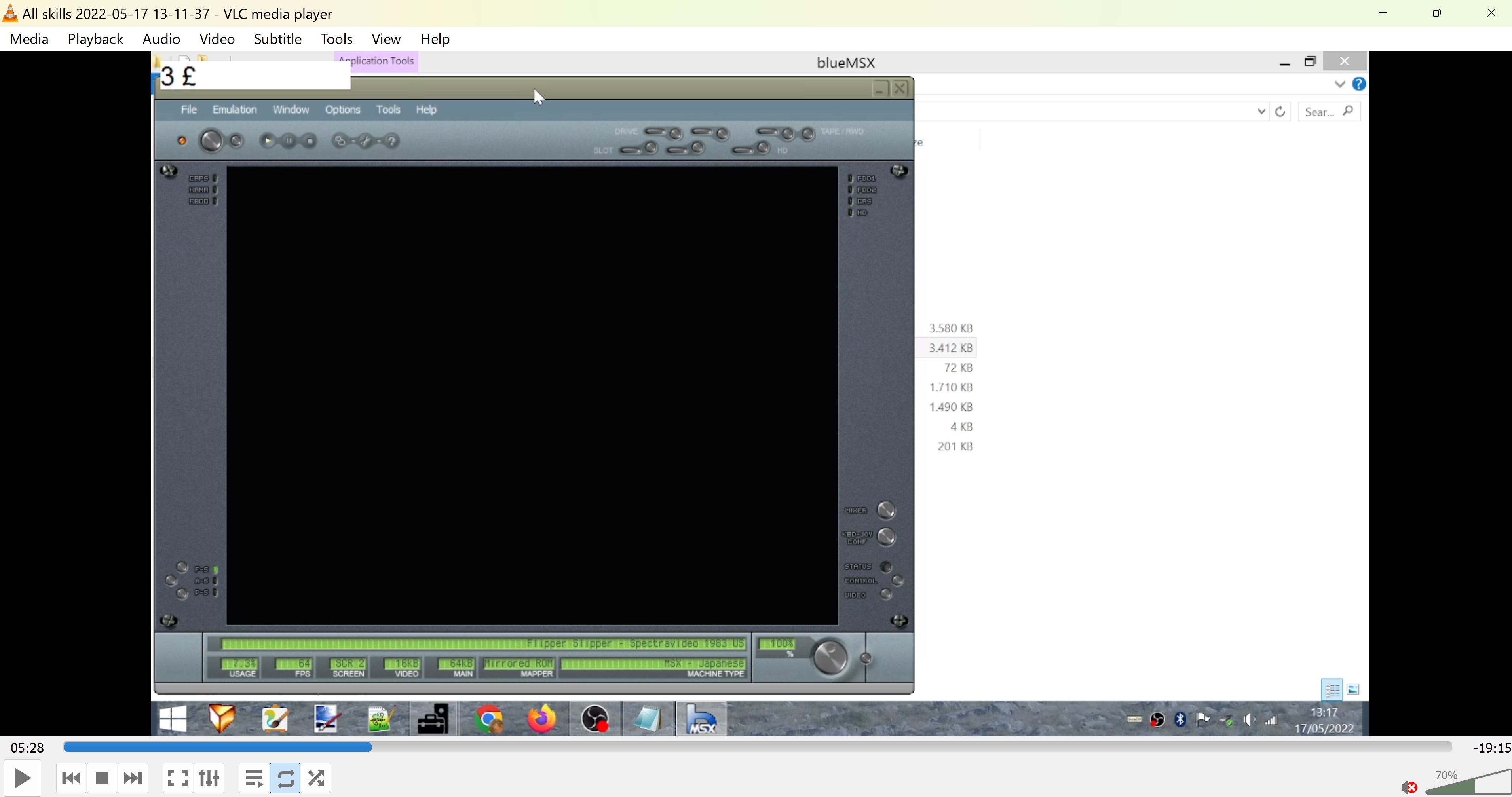 Emulation checked, game checked, Skill 3 selected (3 / £ recorded), gameplay checked, score checked.