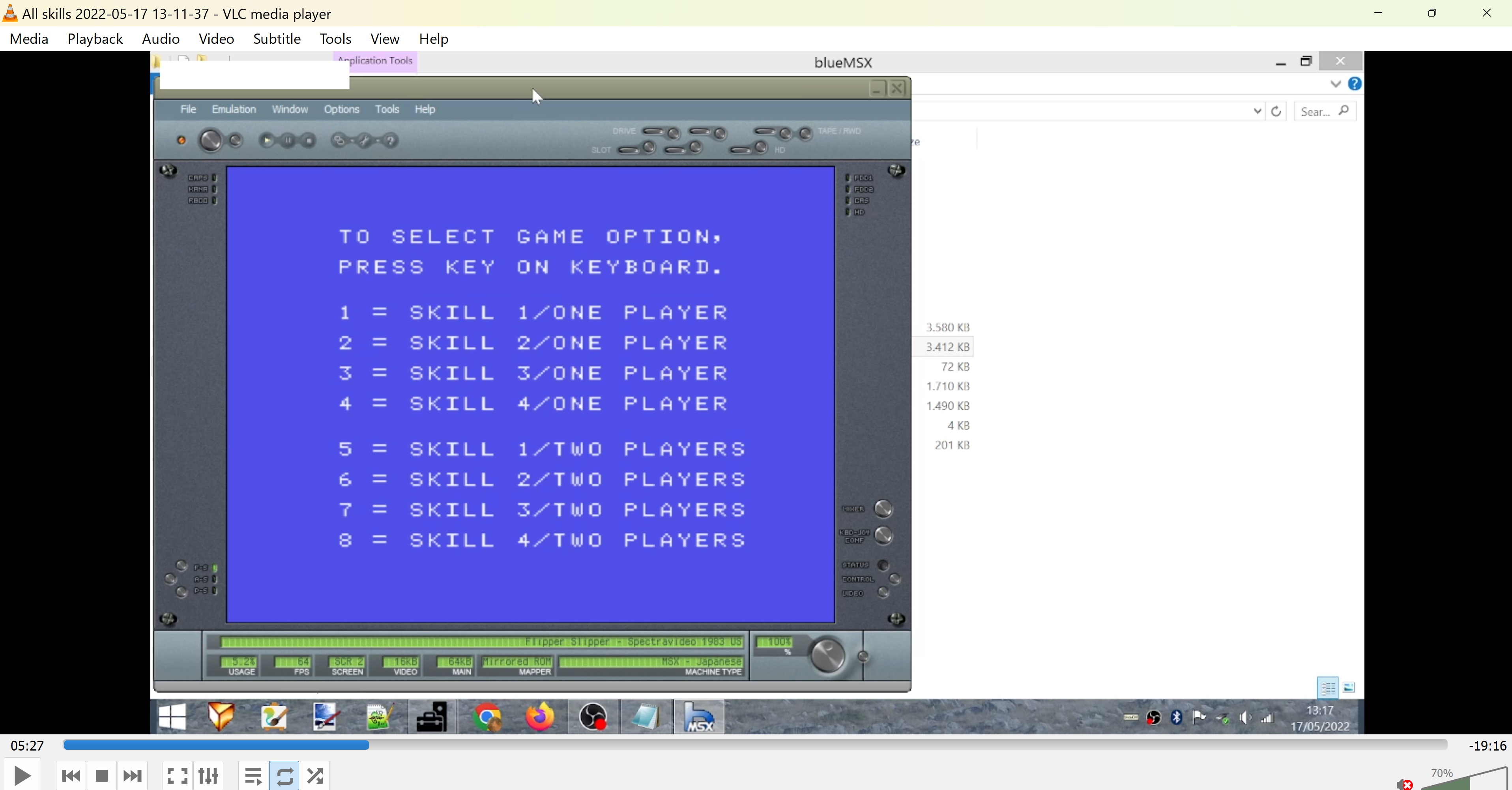 5:27/5:28 Selecting game options. You can notice a "3" in the upper left corner of the screen (it briefly comes into view). This means that the key "3" has been pressed to select "SKILL 3/One player".