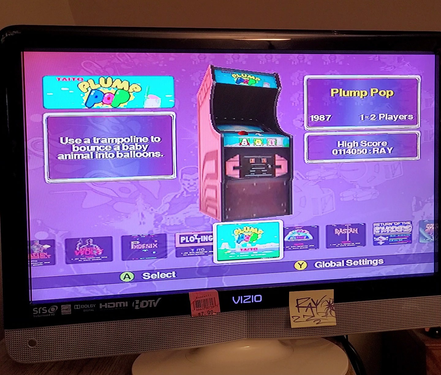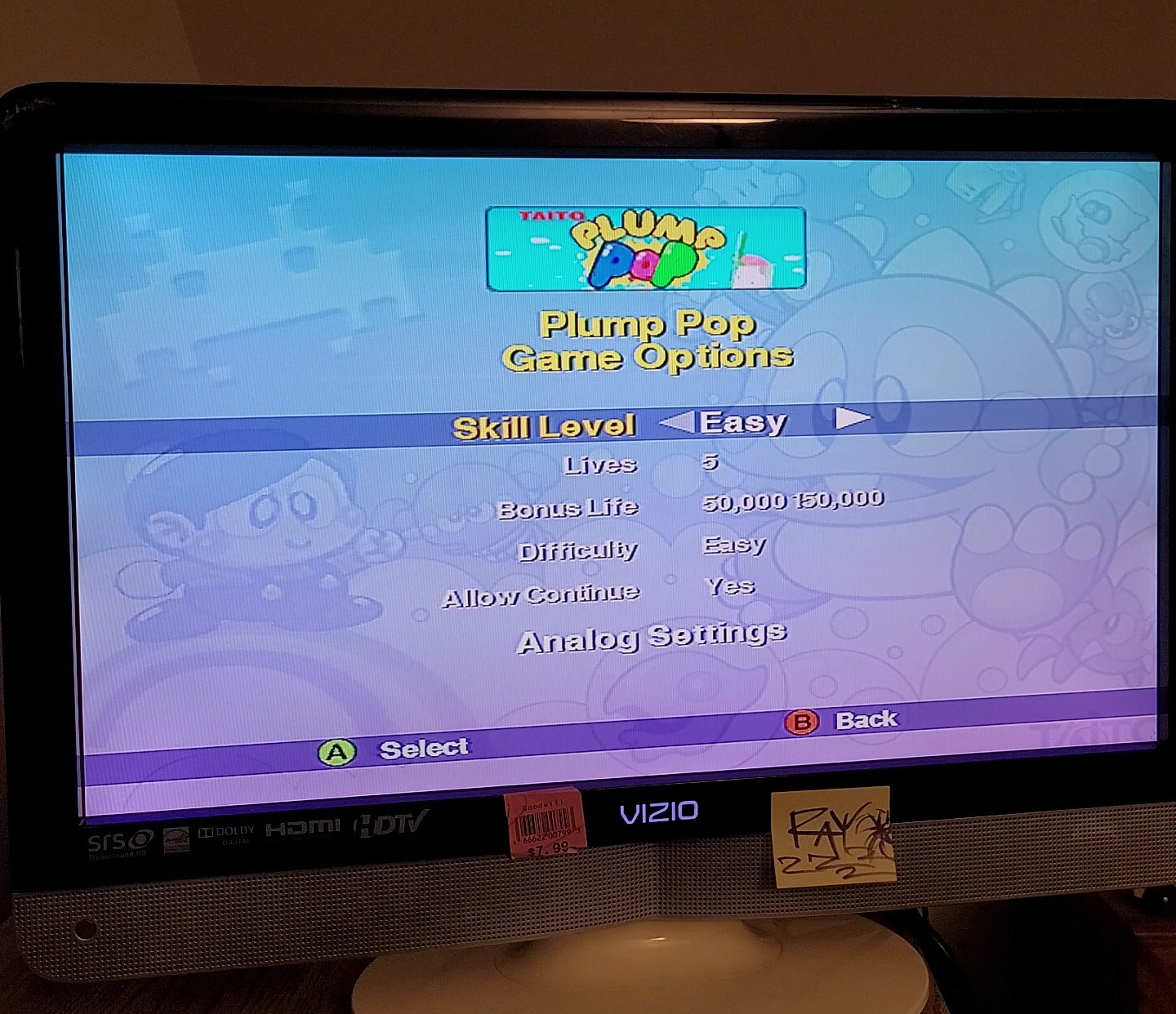 Game checked, Plump Pop selected, Skill Level Easy selected, gameplay checked, score checked, initials checked, hardware checked.