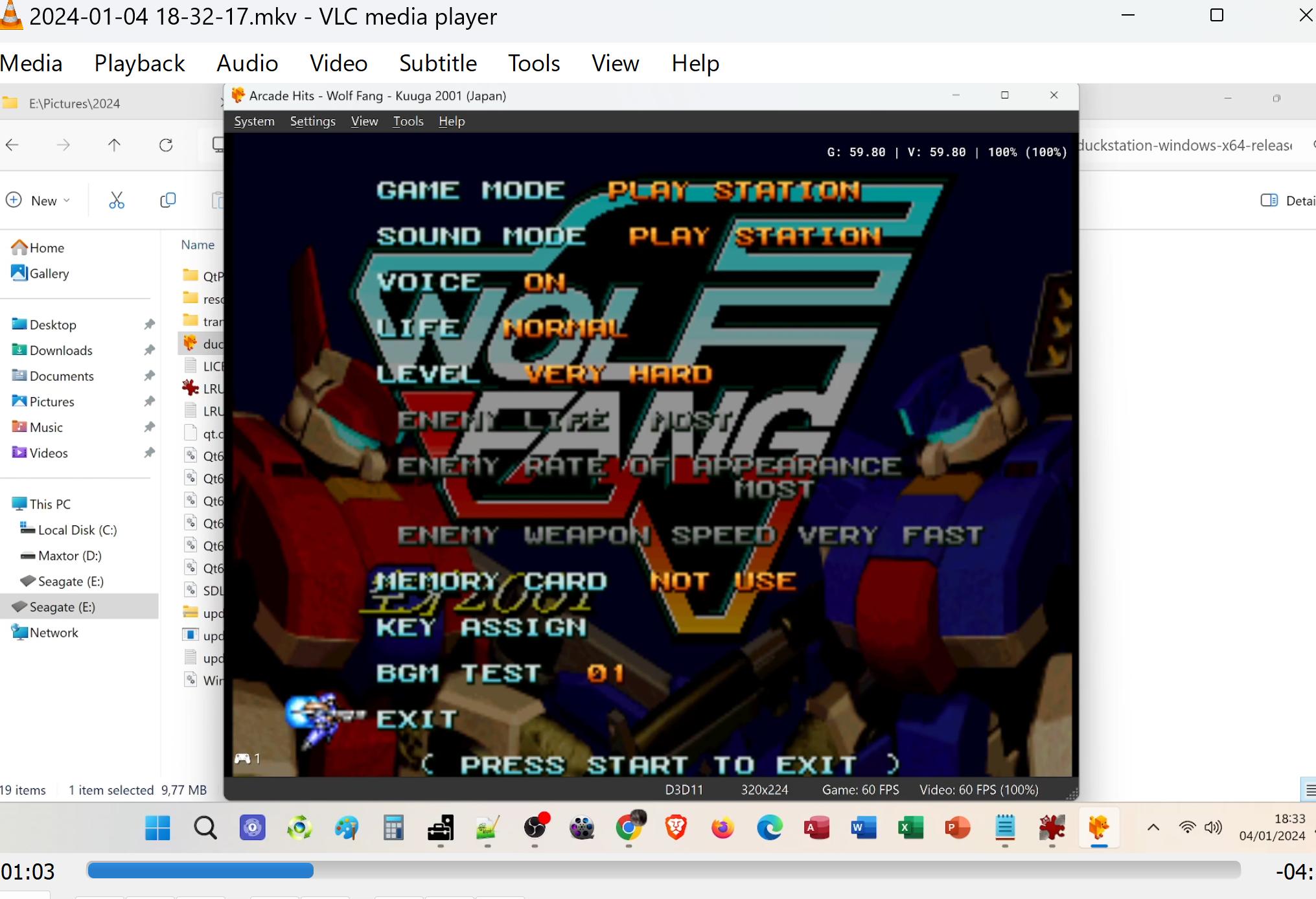 "Wolf Fang: Kuuga 2001" has two selectable game modes ("Play Station" and "Arcade") and four selectable skill levels ("Easy", "Normal", "Hard", and "Very Hard").