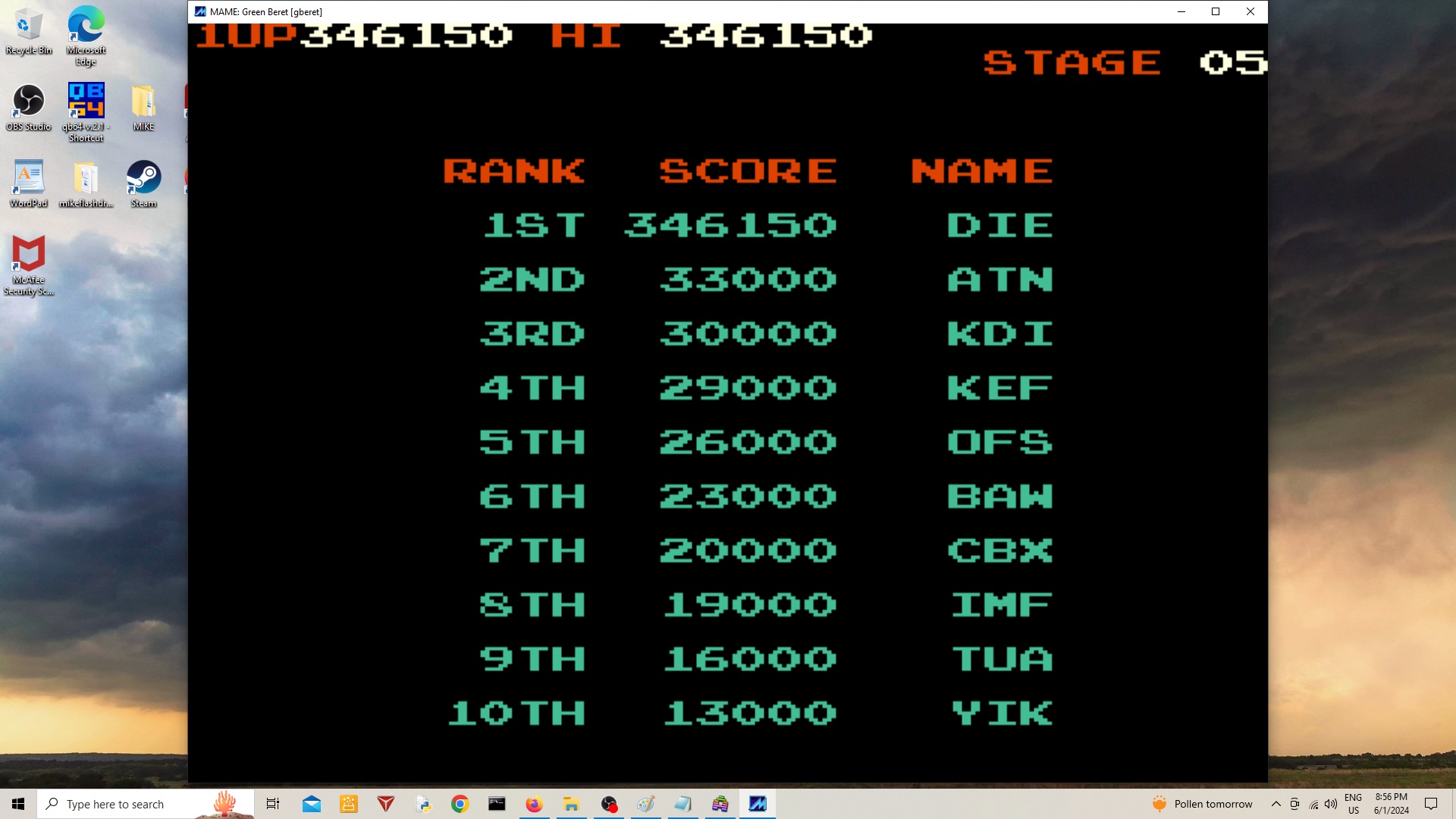 Emulation checked, game checked, gameplay checked, score checked, initials checked.
